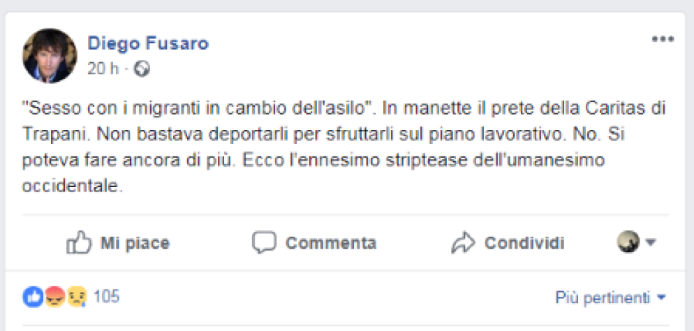 Infine un post su Facebook dell'"intellettuale di punta" dei sovranisti Diego Fusaro che ritira fuori lo scandalo dell'ex direttore della Caritas di Trapani don Sergio Librizzi che chiedeva agli immigrati prestazioni sessuali in cambio di permessi di asilo. Commento del post: «non bastava deportarli per sfruttarli sul piano lavorativo. No. Si poteva fare ancora di più. Ecco l'ennesimo striptease dell'umanesimo occidentale».