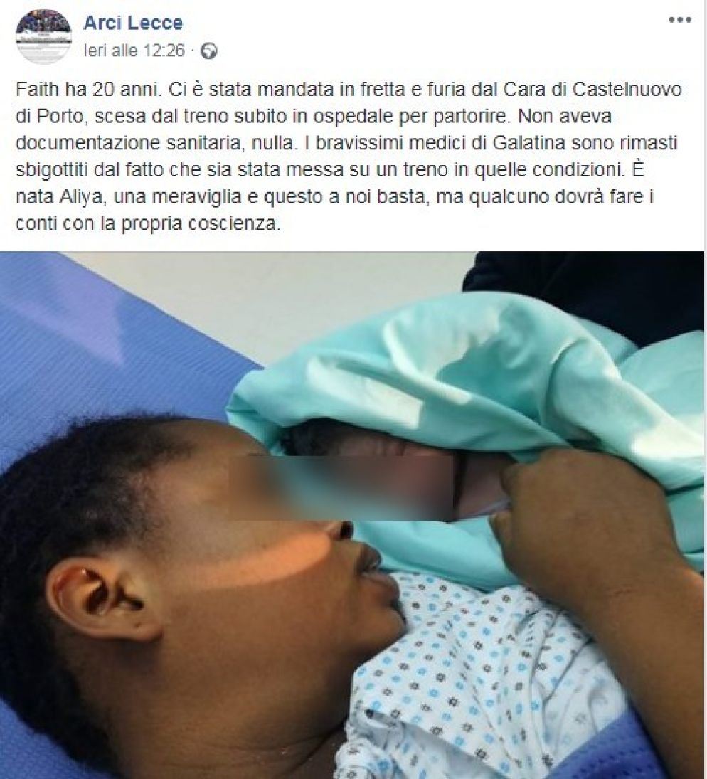 "Faith ha 20 anni. Ci è stata mandata in fretta e furia dal Cara di Castelnuovo di Porto, scesa dal treno subito in ospedale per partorire. Non aveva documentazione sanitaria, nulla. I bravissimi medici di Galatina sono rimasti sbigottiti dal fatto che sia stata messa su un treno in quelle condizioni". Così l'Arci di Lecce nella pagina facebook dell'associazione che gestisce un sistema di centri di accoglienza Sprar nel capoluogo salentino. "E nata Aliya, una meraviglia e questo a noi basta, ma qualcuno dovrà fare i conti con la propria coscienza", aggiunge l'Arci.