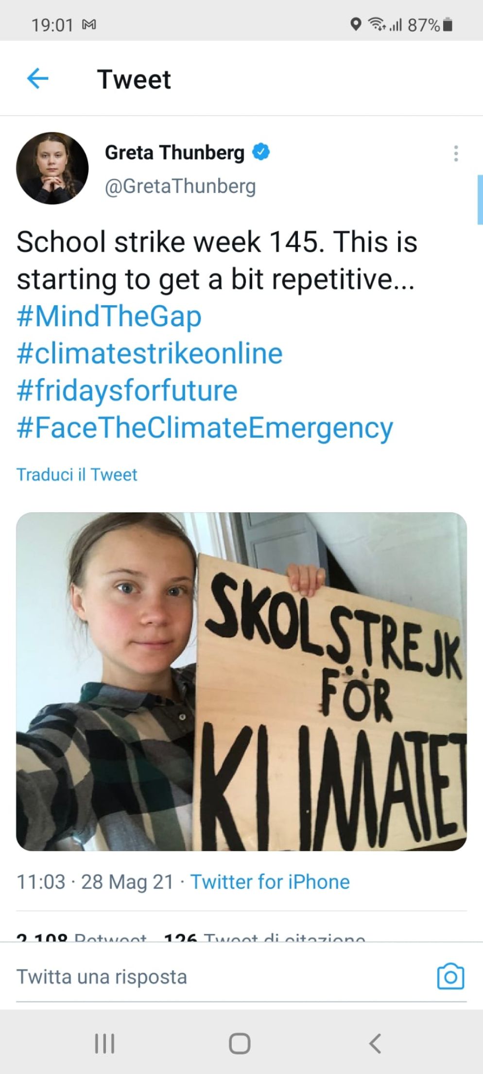 «Sciopero per il clima, settimana 145. Tutto questo sta per diventare un po’ ripetitivo» scrive nel tweet postato lo scorso 22 maggio.