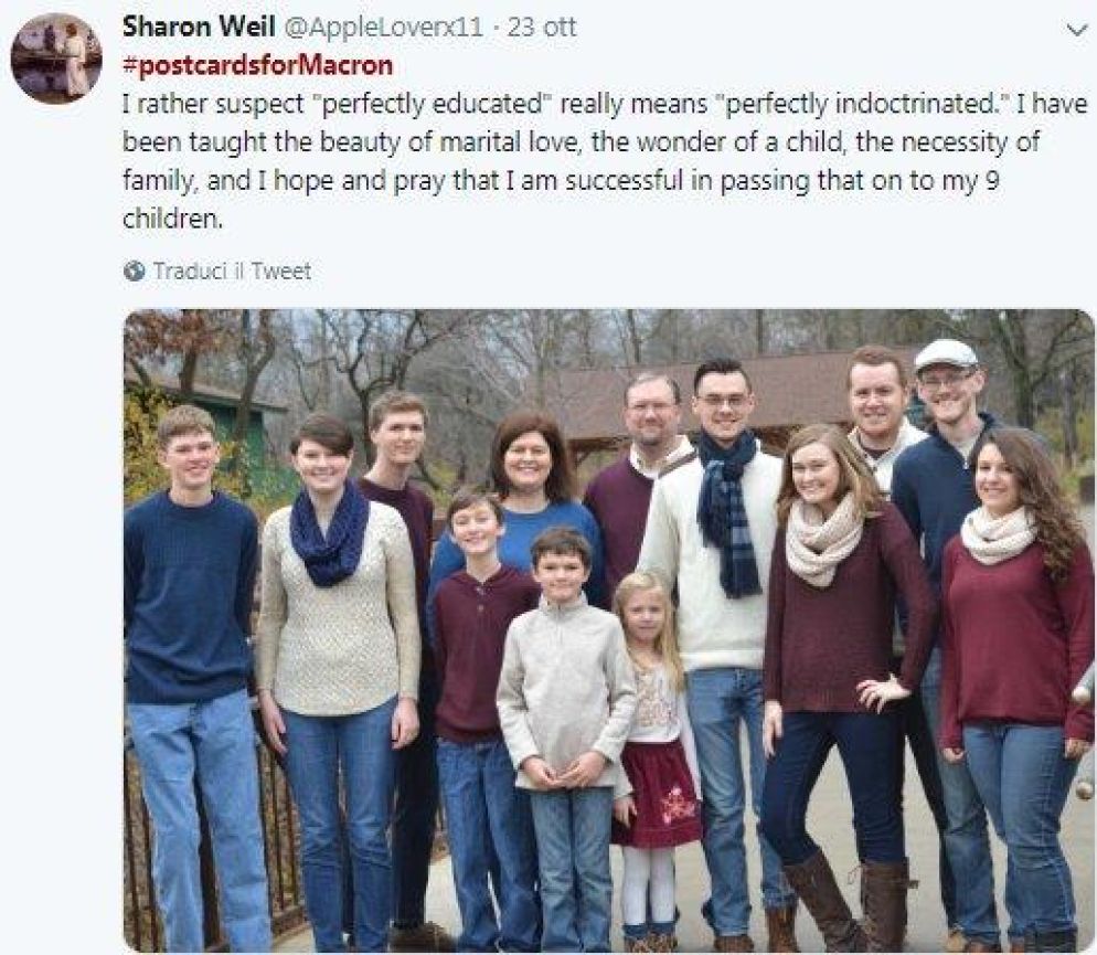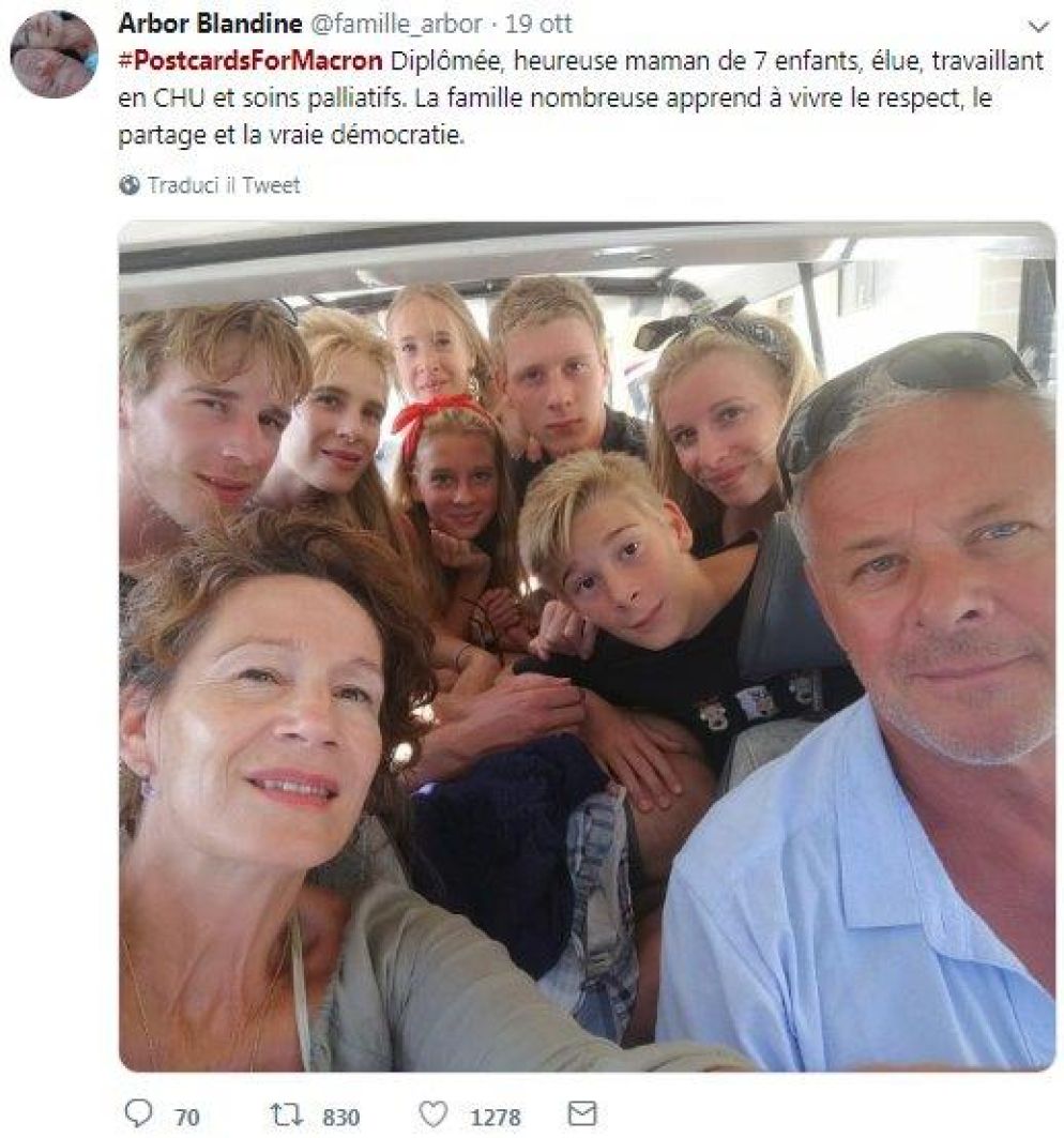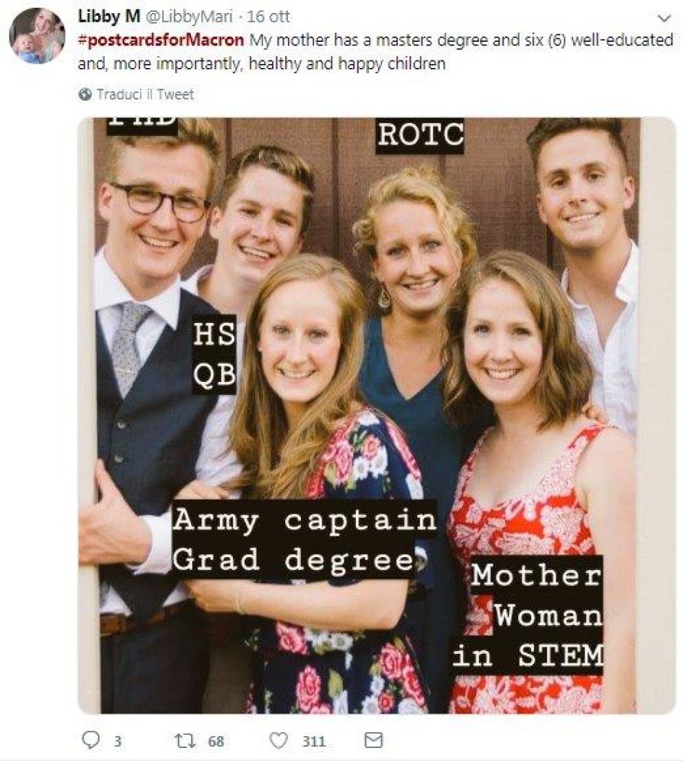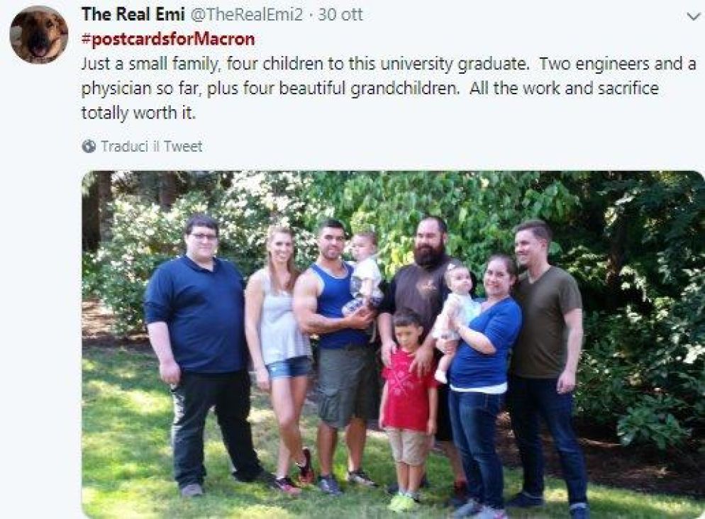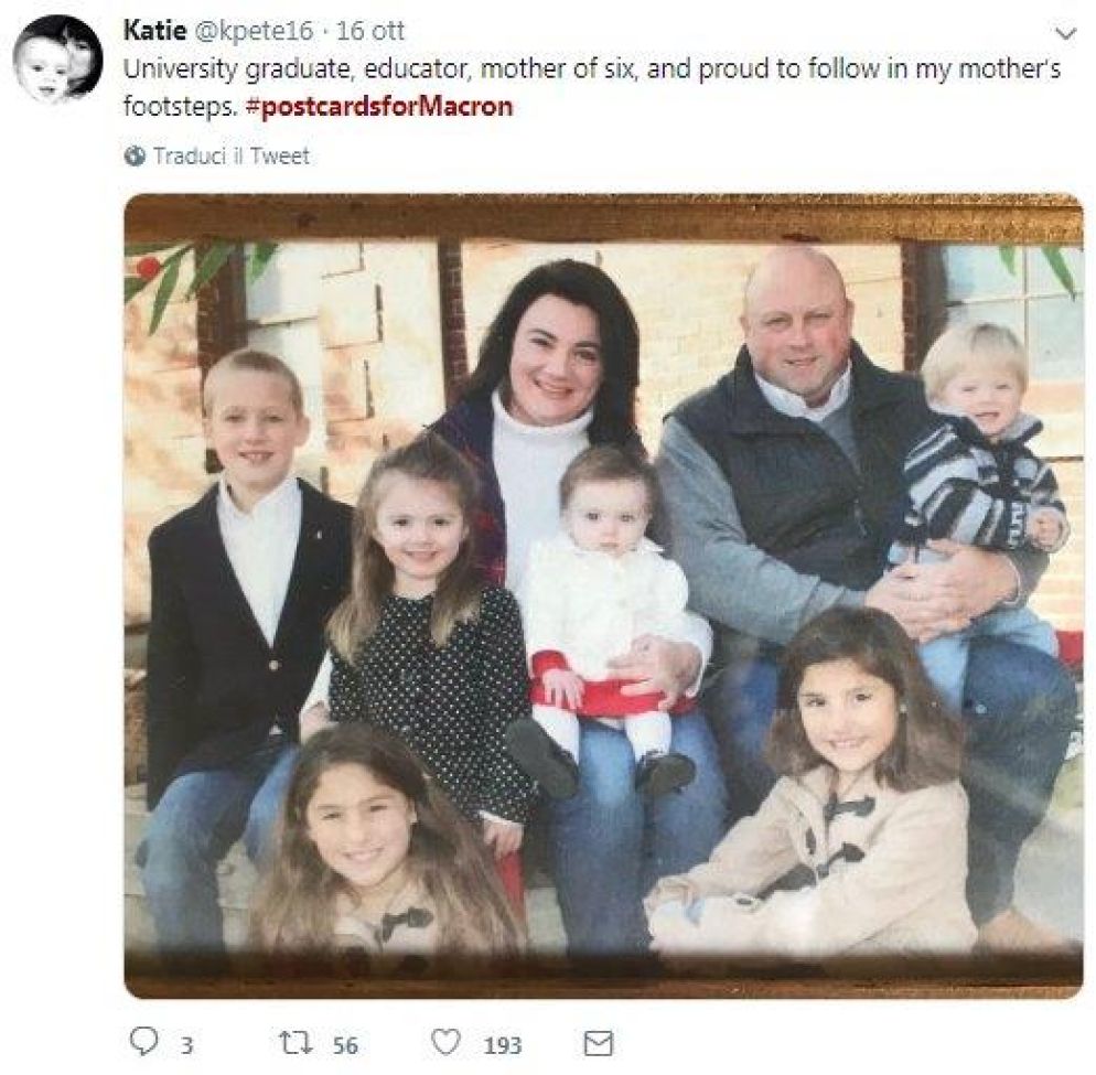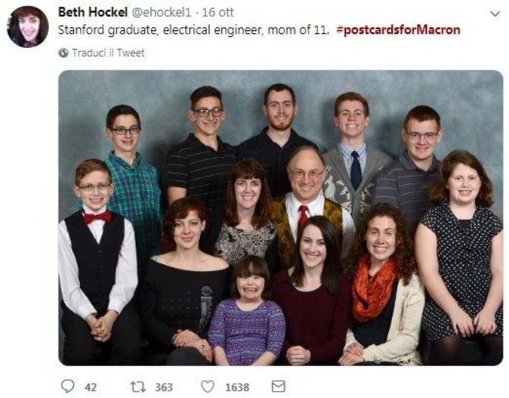Le parole del presidente francese sarebbero finite nel dimenticatoio se non fosse che dopo aver visto a distanza di un mese un servizio del Guardian sull'argomento, la dottoressa Catherine R. Pakaluk, docente di ricerca sociale ed economica all'Università Cattolica di Washington, e madre di 6 figli, ha deciso di pubblicare la foto della propria famiglia su Twitter seguita dall'hasthag #postcardsforMacron (cartoline per Macron).