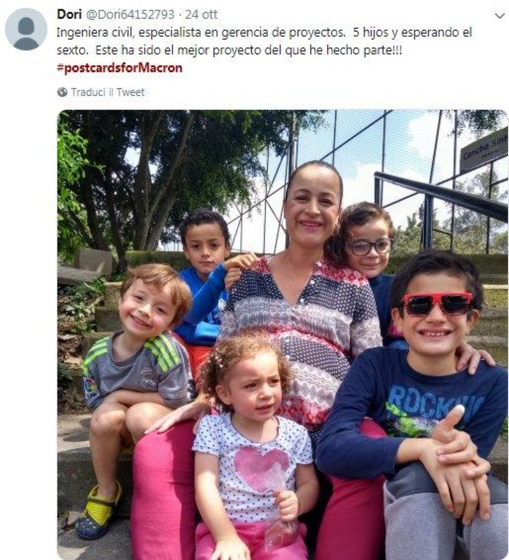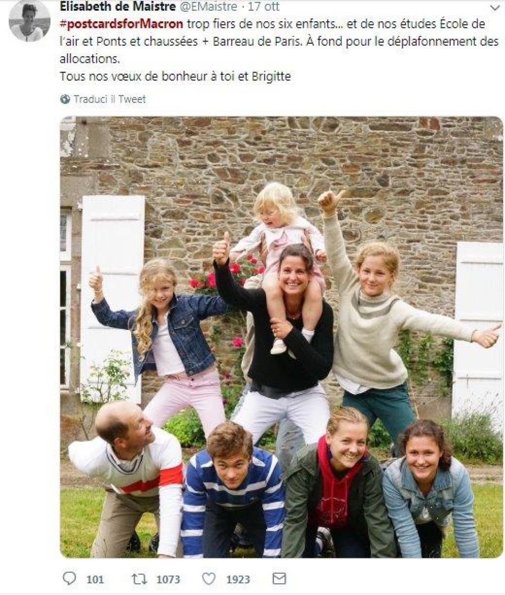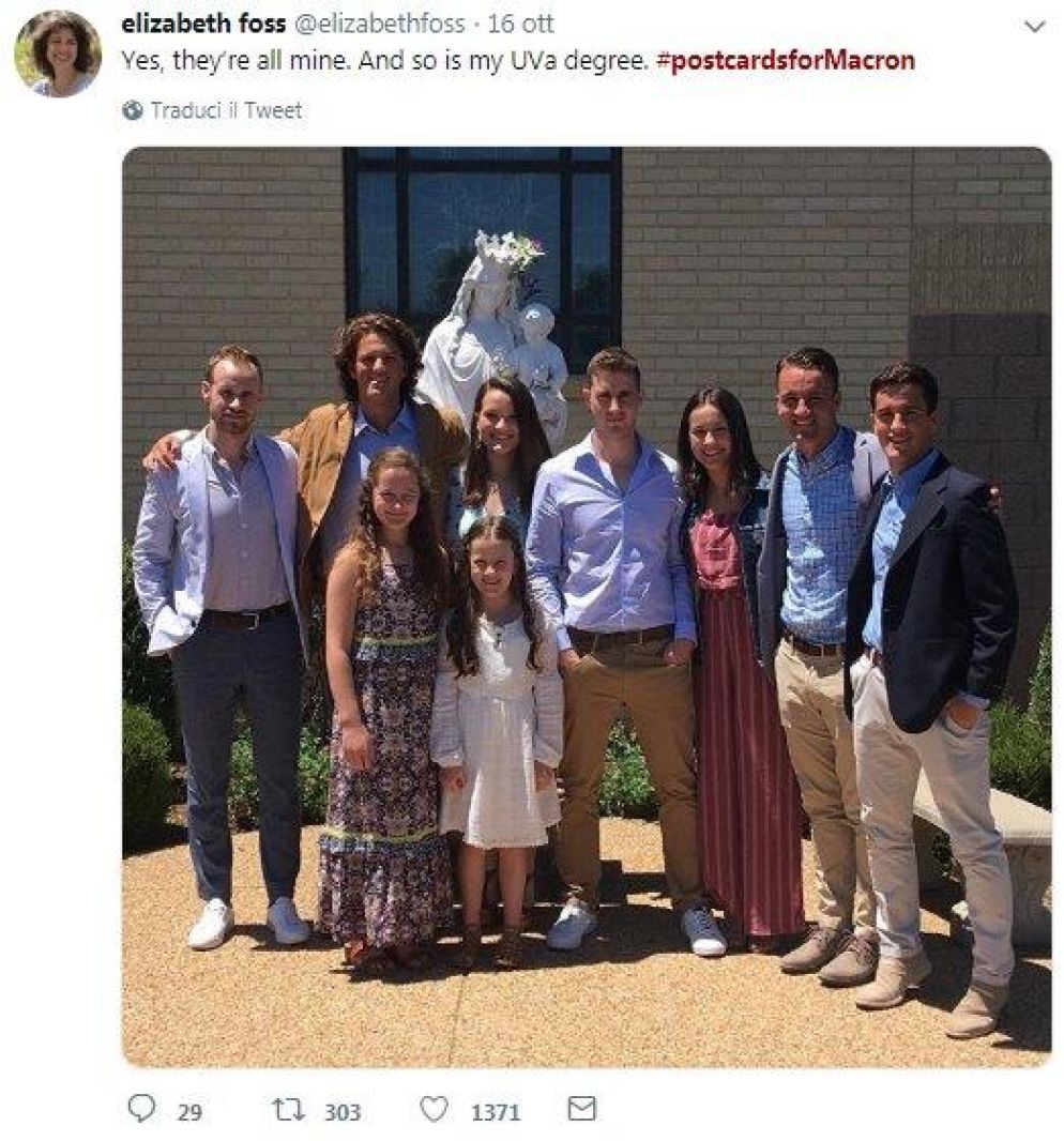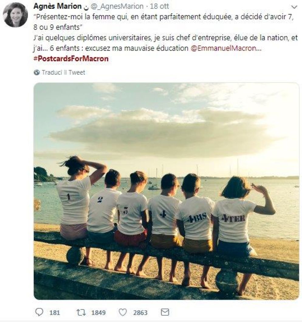 Le parole del presidente francese sarebbero finite nel dimenticatoio se non fosse che dopo aver visto a distanza di un mese un servizio del Guardian sull'argomento, la dottoressa Catherine R. Pakaluk, docente di ricerca sociale ed economica all'Università Cattolica di Washington, e madre di 6 figli, ha deciso di pubblicare la foto della propria famiglia su Twitter seguita dall'hasthag #postcardsforMacron (cartoline per Macron).