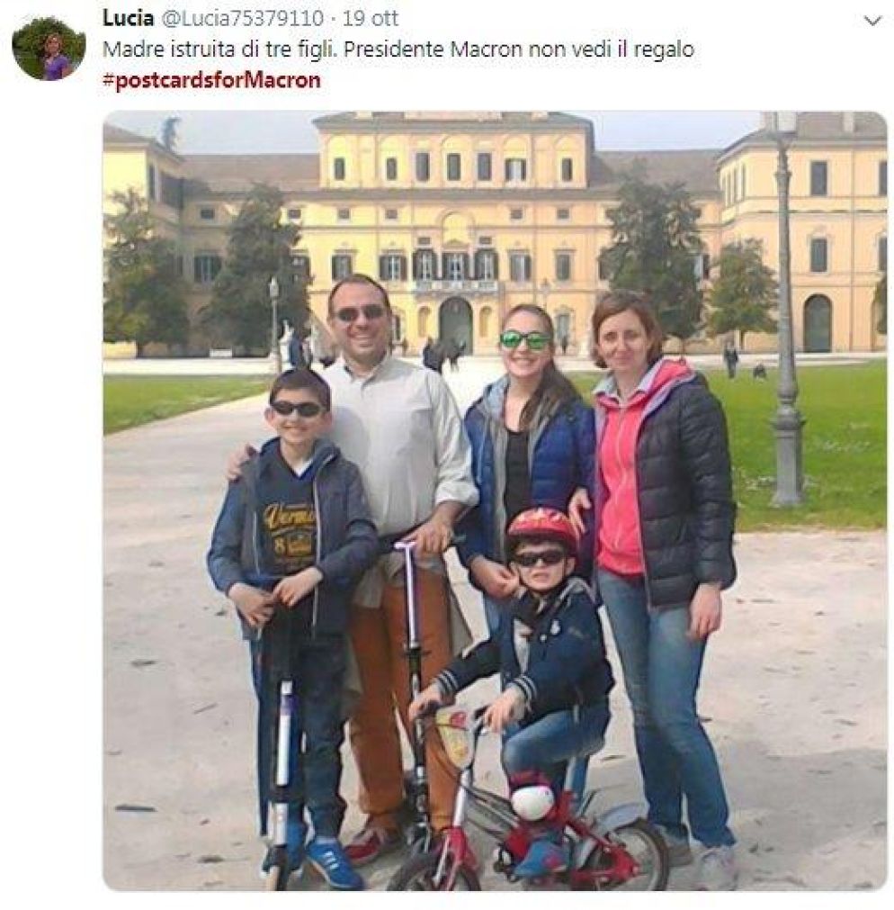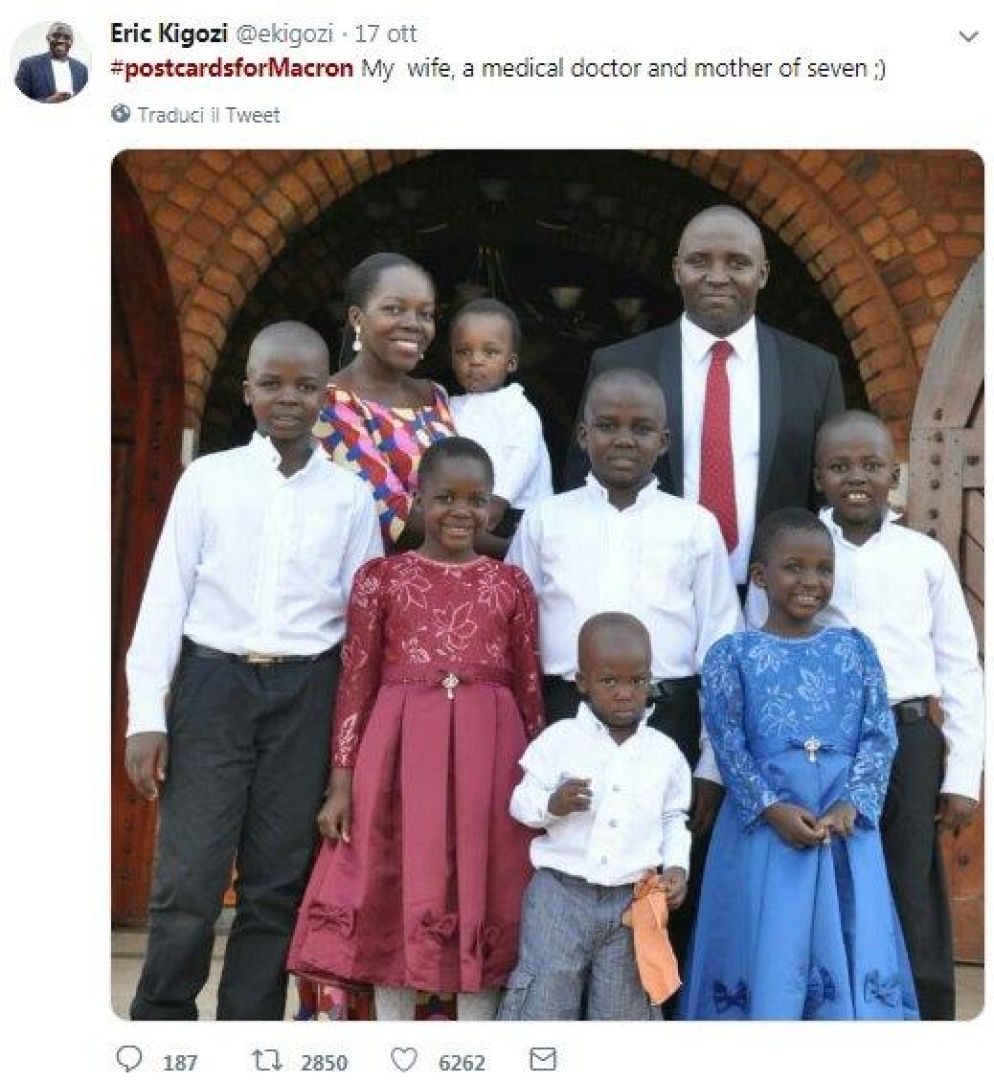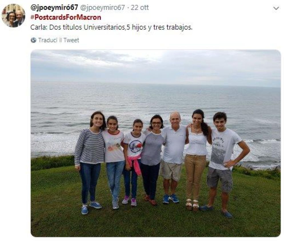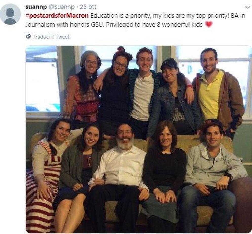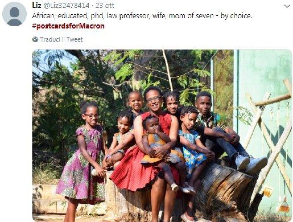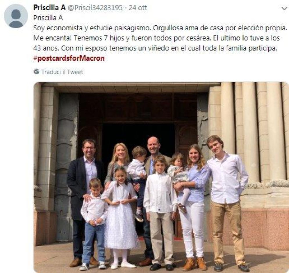 Le parole del presidente francese sarebbero finite nel dimenticatoio se non fosse che dopo aver visto a distanza di un mese un servizio del Guardian sull'argomento, la dottoressa Catherine R. Pakaluk, docente di ricerca sociale ed economica all'Università Cattolica di Washington, e madre di 6 figli, ha deciso di pubblicare la foto della propria famiglia su Twitter seguita dall'hasthag #postcardsforMacron (cartoline per Macron).