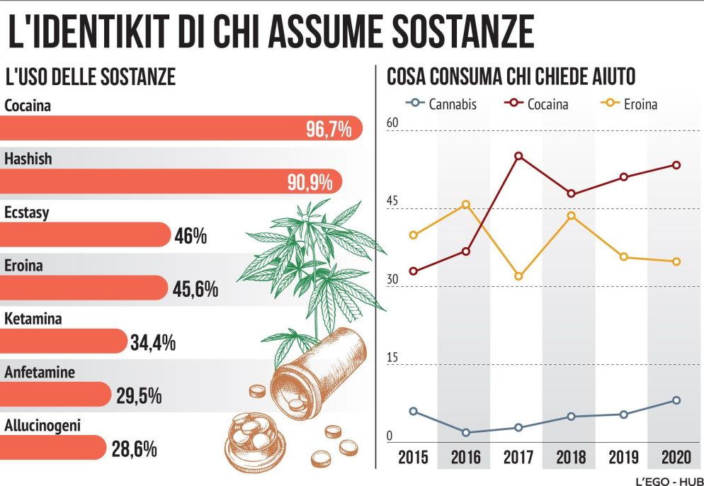 Ma la cocaina non basta più da sola: nel 90% dei casi si consuma assieme ad altro, alcol e cannabis (consumata nel 90% dei casi), con quest’ultima che è diventata dipendenza primaria nell’8,3% dei casi (contro poco più del 5% dell’anno scorso): è il dato più alto, anche questo, registrato dall’Osservatorio a partire dal 2015. Unito alle concentrazioni altissime di principio attivo presenti nelle dosi spacciate sul mercato (tra il 20% e il 28% secondo le stime dell’Agenzia europea delle droghe), segno di una nuova emergenza. Ma anche ketamina (34,4%), amfetamine (29%) e psicofarmaci fanno la loro parte, mix micidiali che arrivano a strutturare dipendenze incontrollate già a vent’anni. Che prendere in carico e curare diventa sempre più complicato.