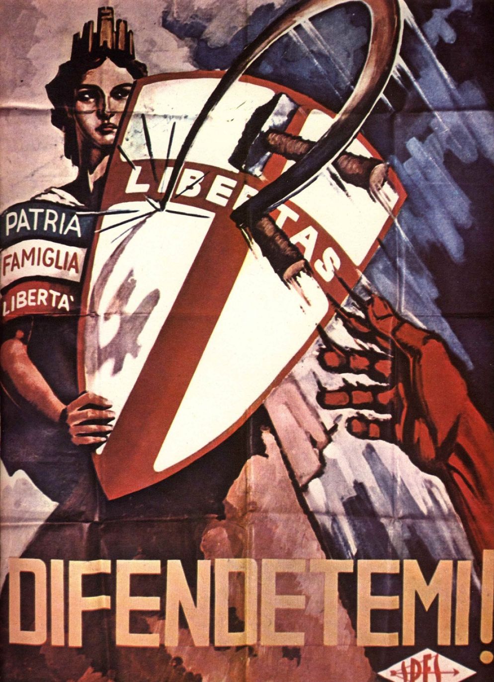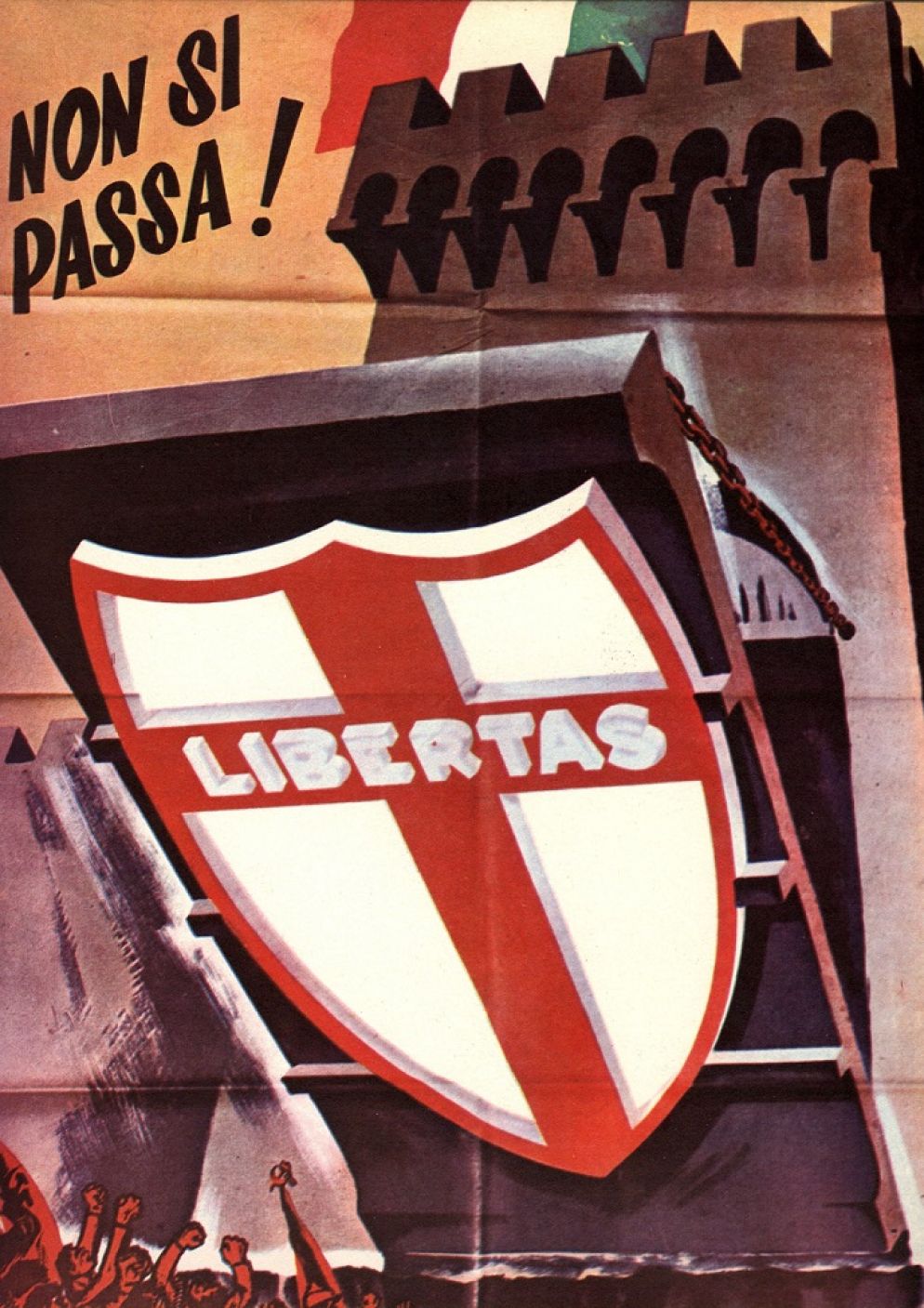 Per rendere esplicito il progetto, si sviluppano e scontrano le due principali culture, la cultura cattolica e la cultura social-comunista. Quelle che ormai storiograficamente sono state definite le “due chiese” si fronteggiano in una lotta senza esclusione di colpi fatta di slogan, riti e simboli di cui le elezioni del ’48 costituiscono un laboratorio pionieristico. Le invettive di Riccardo Lombardi, il “microfono di Dio”, insieme all’imperativo del «grande dovere» diffuso dalle colonne dell’“Osservatore Romano” alla vigilia del voto, acquistano un valore ancora più forte se messe a fianco e a confronto con la pubblicistica minore e gli interventi delle varie figure del mondo cattolico. Orientare il voto a favore della Dc vuol dire costruire le basi della nuova società, al fine di consolidare l’egemonia della cultura cattolica che ha un riflesso anche sulla fiducia di una classe dirigente impegnata nel difficile compito di offrire un’identità democratica al paese. Vengono irrise le immagini del nemico comunista che assume le sembianze di un diavolo o di un carro armato sovietico che schiaccia la democrazia, sia nei disegni che nelle metafore verbali, ma nello stesso tempo si insiste sulla necessità della vittoria della Dc come il partito che è diventato un riferimento ideale per la stabilità del paese e di tutti i cittadini. La modernità della campagna elettorale si condensa dunque in accenti posti di volta «contro» gli avversari e «a favore» di un partito che si candida a diventare il baricentro del sistema politico italiano.