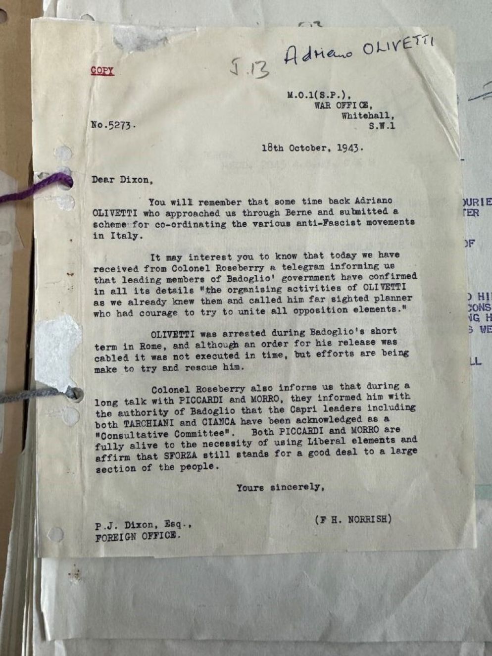 L’attività intellettuale, imprenditoriale e politica di Olivetti è nota a tutti, così come l’impegno e la passione per il suo Paese, compresa la sua attività di collaborazione con l’intelligence degli Alleati. «Qualche tempo fa, il governo britannico ha desecretato il file su Adriano Olivetti, aka Brown. Codice HS 9/1119/7 compresa tra il 1939 e il 1946 con tutti i dettagli – aggiunge Maggi -. Per gli amanti di file desecretati e cablogrammi dell’intelligence britannica, questo archivio è il tempio dove trovare un’incommensurabile quantità di materiale inedito e verità top secret su tutti i Paesi del mondo». Leggendo i cabli di Mr. Brown si scopre che stava organizzando un vero e proprio colpo di Stato contro Mussolini. Dunque un golpe contro il regime fascista come dimostrano «le lettere dell’intelligence di Sua Maestà che parlano di lui e delle sue attività clandestine – sottolinea la giornalista -. Dei suoi piani segreti era a conoscenza anche il Vaticano». Nella prima pagina del fascicolo in una lettera datata 18 ottobre 1943 si nota la fiducia degli inglesi nei confronti di Olivetti: «Il colonnello Roseberry, capo del Soe in Italia aveva preso informazioni su di lui e sono decine le pagine di documenti che confermano la triangolazione tra l’intelligence di Churchill, Mr. Brown e il Vaticano – riflette Maggi -. Tutti coinvolti ed impegnati a rovesciare la dittatura di Mussolini». Nella stessa missiva, a firma di Norrish, del gabinetto di guerra britannico, inviata a Dixon del Foreign Office si legge: «Ricorderai che tempo fa Adriano Olivetti, si è rivolto a noi attraverso Berna e ci ha proposto uno schema per coordinare i vari movimenti antifascisti in Italia. Ti interesserà sapere che oggi abbiamo ricevuto dal Colonnello Roseberry un telegramma che ci informa che membri di spicco del governo Badoglio hanno confermato in tutti i suoi dettagli le attività organizzative di Olivetti come già le conoscevamo e lo chiamavamo il pianificatore lungimirante che ha avuto il coraggio di cercare di unire tutti gli elementi di opposizione» si legge nella missiva desecretata. Olivetti, prosegue la lettera «fu arrestato durante il breve mandato di Badoglio a Roma, e sebbene sia stato trasmesso un ordine per il suo rilascio non è stato eseguito in tempo, ma si stanno facendo sforzi per cercare di salvarlo». Dunque un’azione, quella dell’imprenditore piemontese, nato a Ivrea l’11 aprile 1901, che viene confermata dal corposo carteggio: «Si tratta di centosedici pagine dense di storia ancora sconosciuta per i più – prosegue Maggi -. Innumerevoli i segreti presenti sulle sue attività e sul suo ruolo attivo. Nel dispaccio del 29/30 luglio 1943, ad esempio, si legge che un’insurrezione contro il regime avrebbe avuto luogo da un giorno all’altro, Badoglio era il probabile leader, e si sarebbe formato un governo provvisorio pienamente sotto il controllo militare con l’obiettivo finale di cacciar via fascisti e tedeschi e di fare pace con gli Alleati». In tutto questo, ribadisce la giornalista che da poco ha pubblicato insieme allo storico Bernard O’Connor Operazione Etna: l’infiltrazione britannica di agenti sovietici in Italia «Olivetti era pienamente coinvolto e, in riferimento alla situazione dei mesi successivi si ammetteva che ci sarebbe potuto essere un breve periodo di scontri, ma che, alla luce dello stato d’animo del Paese, dell’odio per la Germania e il desiderio di pace e il fatto che gli Alleati potessero essere in grado di aiutare, la questione finale non poteva essere messa in dubbio». Un aspetto della vita di Olivetti poco conosciuta che trova conferma nelle carte d’archivio che avvalorano il suo alto profilo di uomo preoccupato delle sorti dell’Italia e per questo pronto a rischiare la vita per un futuro di democrazia e di libertà.