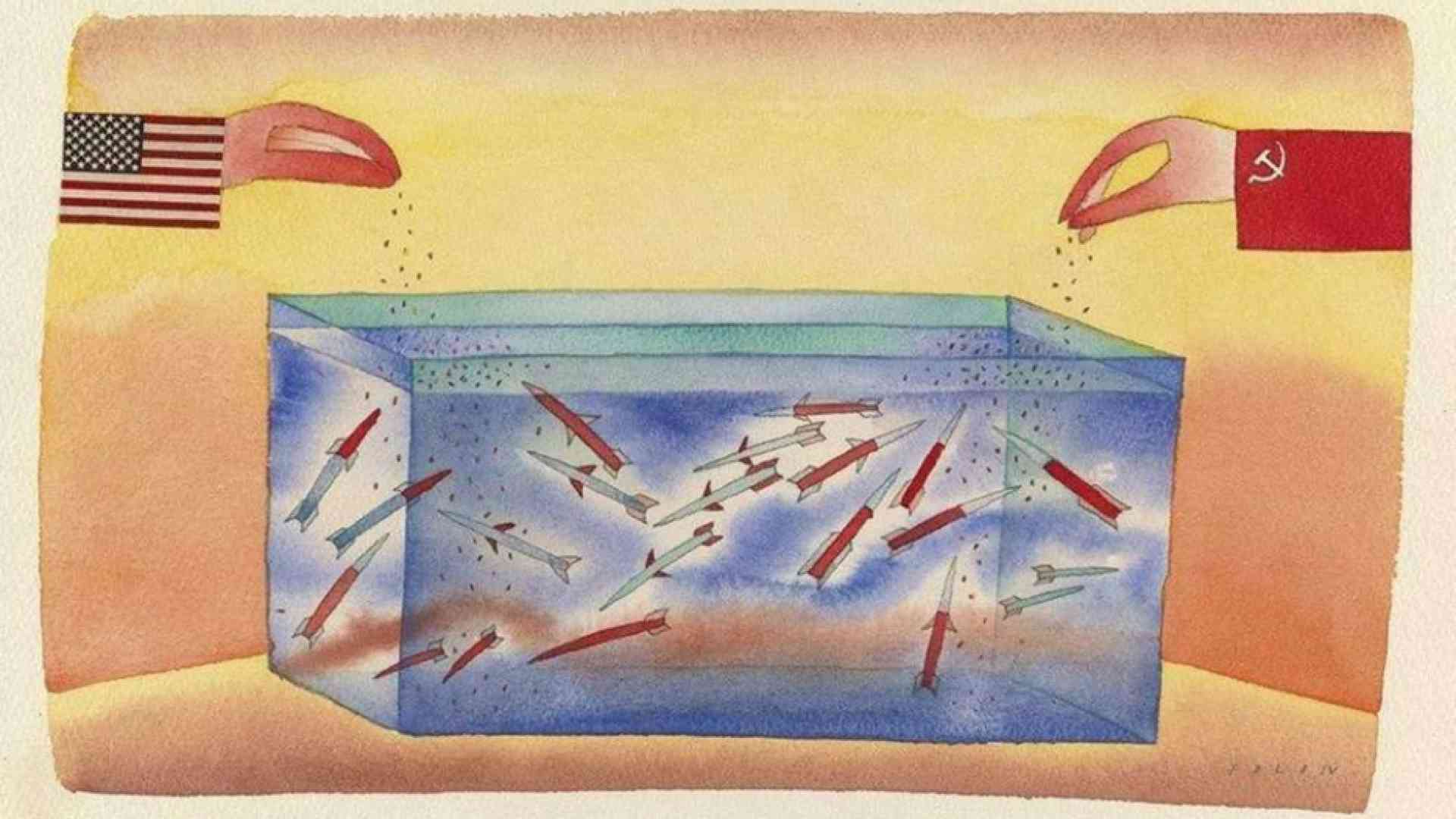 Una mano a stelle e strisce e una con falce e martello danno da mangiare a un acquario pieno di missili famelici. E un acquerello dipinto nel 1983 da Jean-Michel Folon, ma tragicamente attuale. Cambiano (fino a un certo punto) i contesti geopolitici ma non i meccanismi che stanno dietro alle guerre.