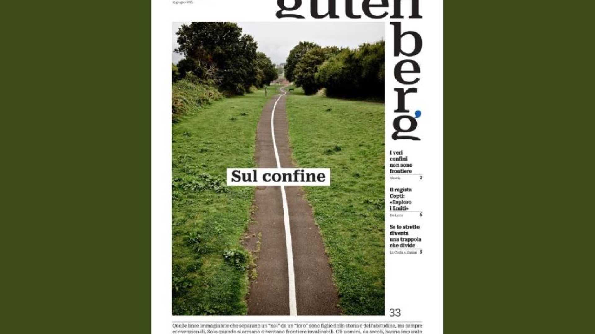 Il 13 giugno "Gutenberg", l'inserto culturale di "Avvenire", si ferma "Sul confine", proponendo alcuni esempi di vite vissute a cavallo di quelle linee immaginarie che possono diventare fin troppo reali: come i contrabbandieri tra Gorizia e Nova Gorica, raccontati da Fulvio Fulvi, o gli sportivi istriani e dalmati che, per uno spostamento di quelle linee, vissero da esuli in patria: ricorda le loro storie Antonio Giuliano, mentre Eugenio Giannetta presenta il progetto "Corti senza confine", un itinerario cinematografico (anch'esso inserito nel quadro di GO!2025, Gorizia/Nova Gorica Capitale europea della cultura 2025)) che racconta la frontiera come esempio virtuoso di incontro. Alessandra De Luca ha intervistato il regista Scandar Copti, il cui nuovo film Happy Holidays esplora i limiti tra realtà, pregiudizi e morale; gli antropologi Franco La Cecla e Piero Zanini si soffermano su quel particolare tipo di confini che sono gli stretti di mare. Chiude il monografico la presentazione della mostra in corso al Palazzodelle Esposizioni di Roma con le immagini vincitrici del World Press Photo Award.