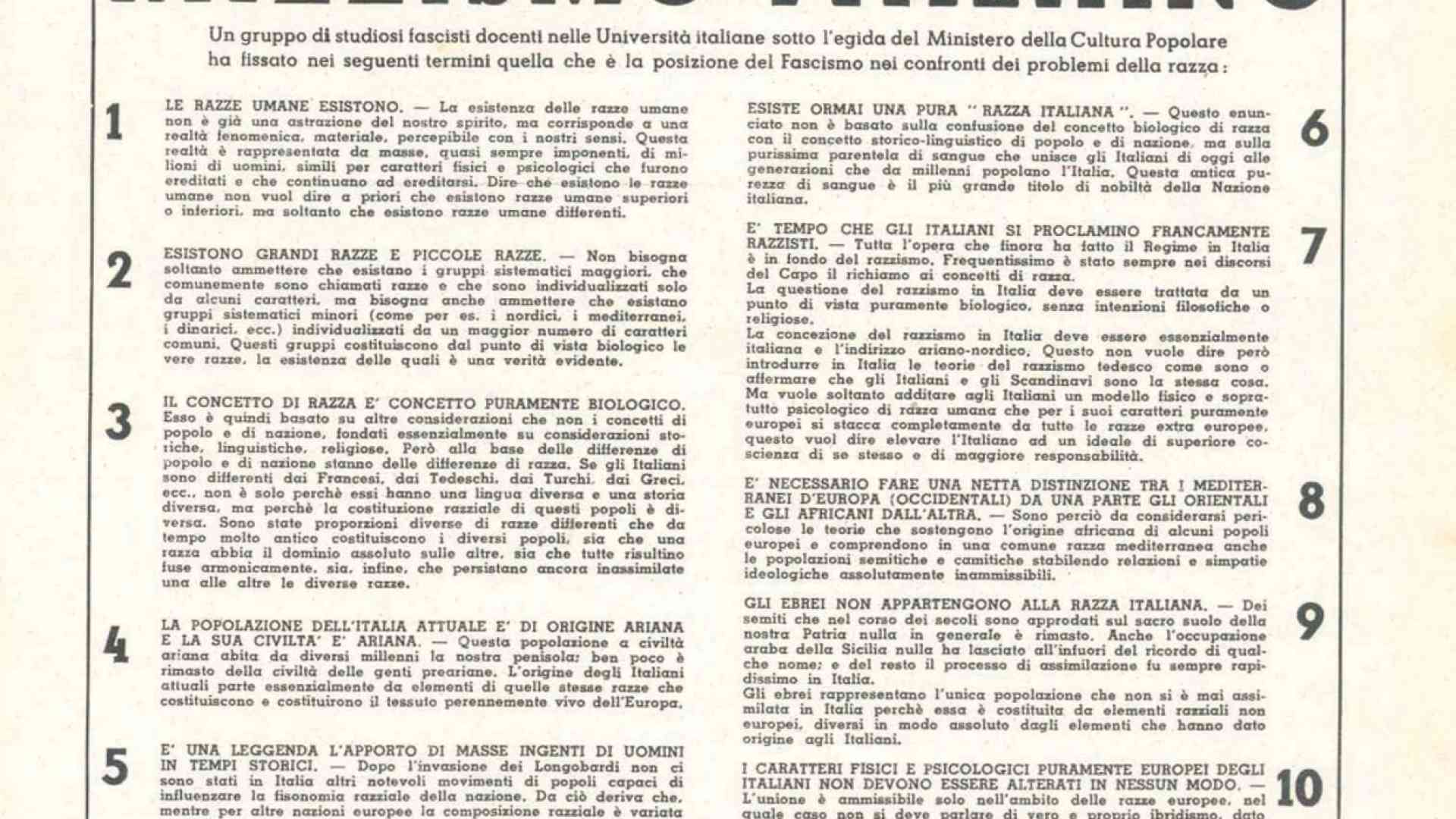 Il 15 luglio 1938 il regime fascista pubblicò il documento di discriminazione razziale da cui nacquero le leggi antisemite