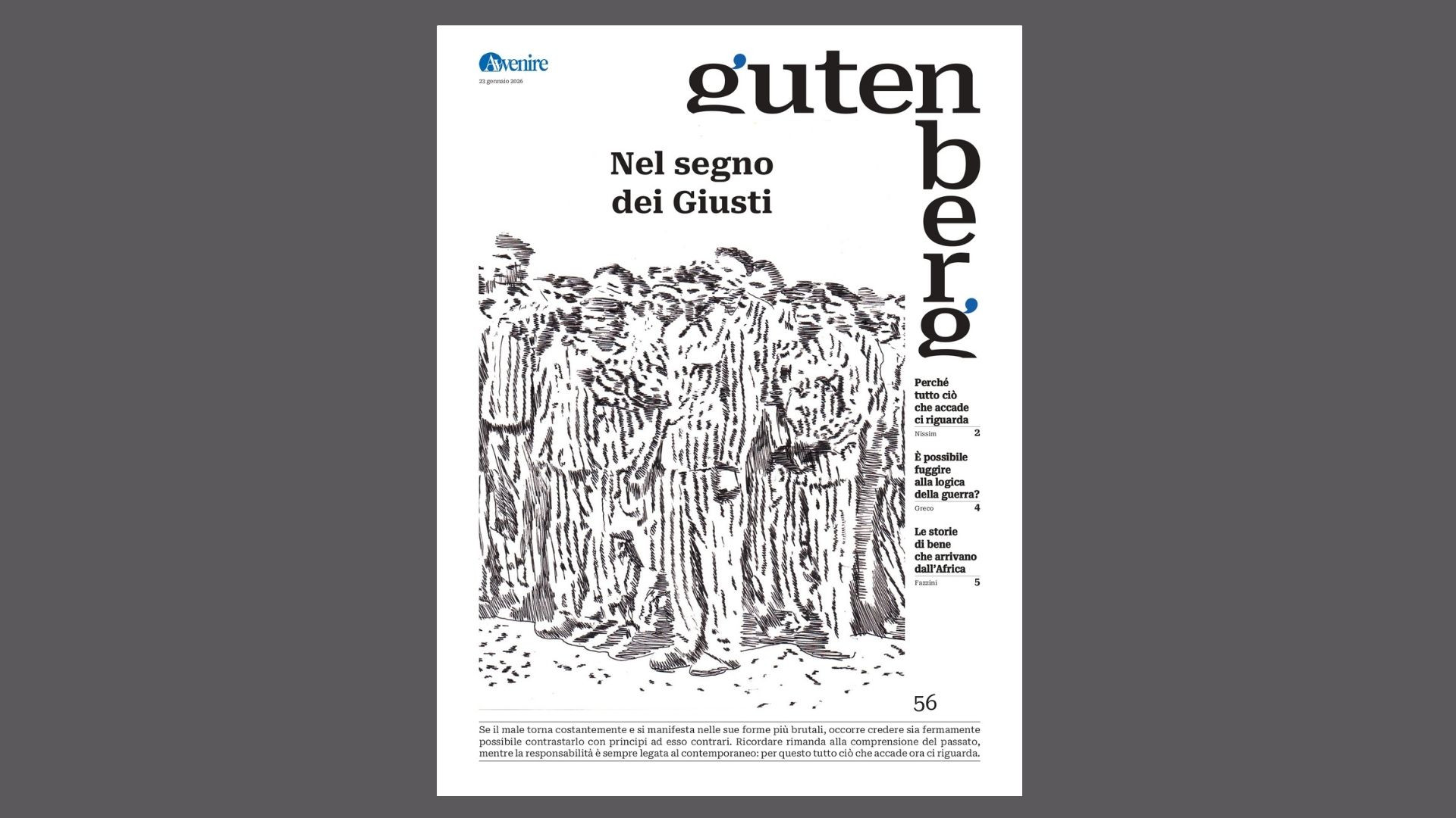 Alla vigilia della Giornata della Memoria, il numero 56 di "Gutenberg", in edicola venerdì 23 gennaio, sceglie di non fermarsi al ricordo delle vittime, ma di interrogare le scelte individuali e le ragioni profonde che, anche nei tempi più bui, hanno saputo opporsi al male. “Nel segno dei Giusti” è il titolo del monografico che attraversa storie, contesti e linguaggi diversi per riflettere su una responsabilità che non appartiene al passato, ma continua a riguardare il presente.