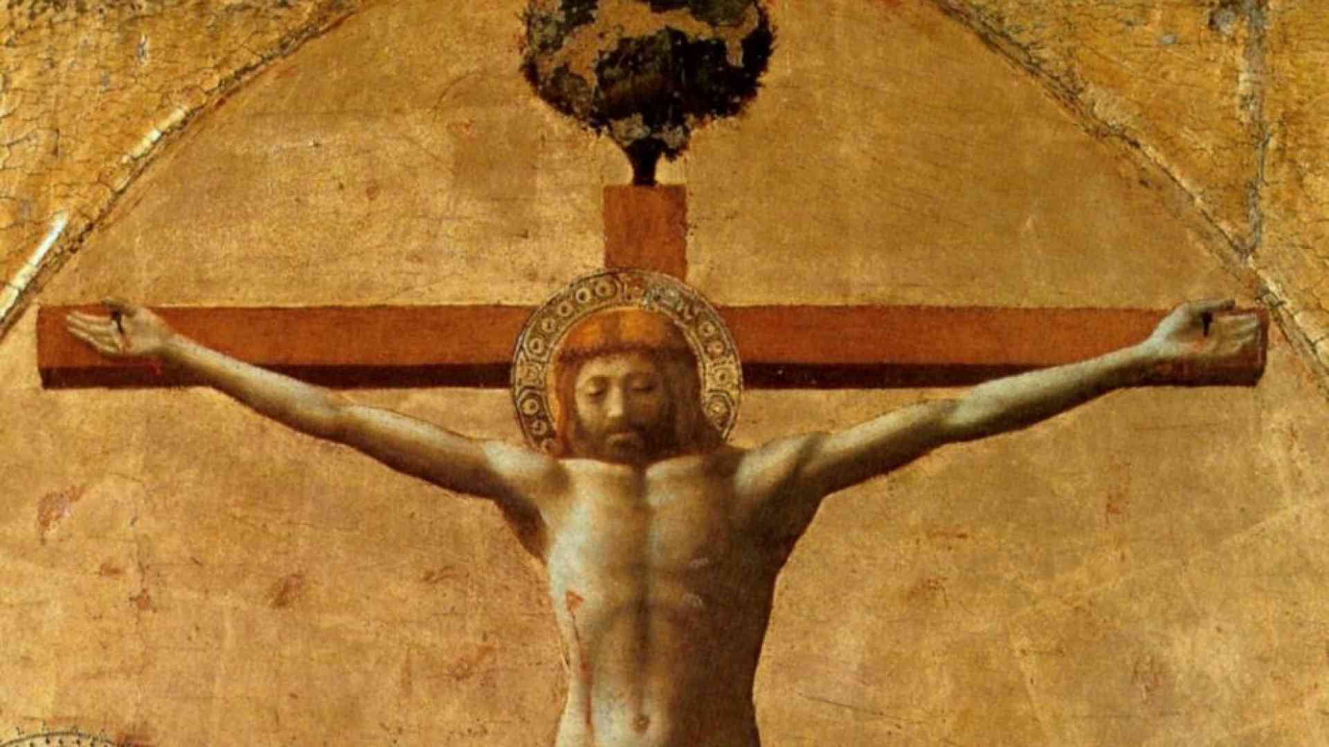 Proprio l’altezza a cui era posto il dipinto spiega la particolarità con cui Masaccio mostra Gesù: è ripreso in forte scorcio, con il capo chinato incassato nelle spalle, come se lo osservassimo stando ai piedi della croce. Da qui il corpo di Cristo ci appare in tutta la sua fisicità, potremmo persino dire che ne percepiamo il peso: la croce dunque come il compimento dell’incarnazione. È un autentico pezzo di bravura, in cui Masaccio applica la prospettiva, invenzione brunelleschiana allora recentissima.