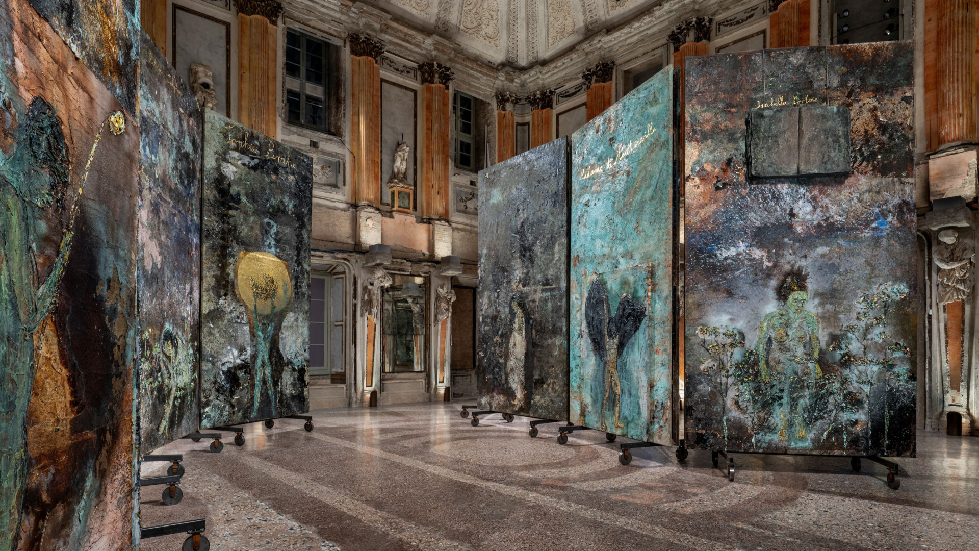 Anche l’allestimento, minimale se non nullo, risulta calibrato. Le tele sono disposte a zigzag, così che i volti delle alchimiste si riflettano negli specchi lungo il perimetro e insieme riaffiorino le cariatidi, crisalidi che sorvegliano il visitatore. I teleri, enormi e magmatici, sono retti dagli stessi carrelli utilizzati negli atelier dell’artista, ben riconoscibili nel film Anselm di Wim Wenders (2023), dove Kiefer recita se stesso fra giri in bicicletta, versi di Paul Celan sussurrati e lunghi piani sequenza. In apertura della pellicola lo si vede spingere con il piede un lavoro monumentale che scivola leggero sulle rotelle. Perché si compia un processo di trasformazione – del resto – non può esservi fissità, e Kiefer lo suggerisce lasciando intendere che tutto si trovi in una fase instabile, come dietro le quinte di un teatro.