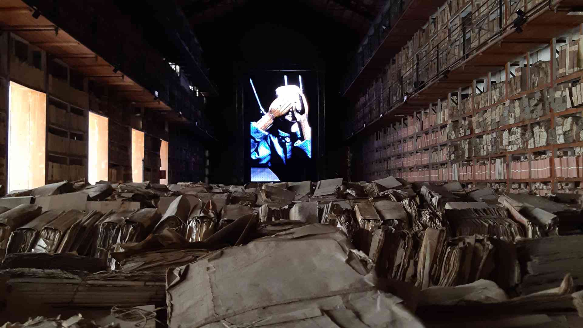 È un’apocalittica visione di macerie quella offerta dai Masbedo all’Archivio di Stato in Protocol no. 90/6, installazione giustamente celebrata come uno degli apici della biennale e che purtroppo è rimasta visibile per pochi giorni (la Soprintendenza ci pensi bene e si trovi il modo per renderla permanente). Durante le ricerche per Videomobile (allestito a Palazzo Costantino, e meno interessante) il duo ha “trovato” un’ala dell’archivio in cui migliaia di faldoni e registri, rimasti sommersi dai calcinacci della Seconda guerra mondia-le, sono stati ridotati di tetto ma non sono stati mai più né aperti né inventariati né quasi ripuliti. È la storia della città che resta lì, inerte e inattingibile, ridotta a un mare di ruderi, metafora di una città amletica sulla quale – da un grande ledwall – il pupo di Vittorio De Seta estende il proprio sguardo come uno sconsolato pantocratore.