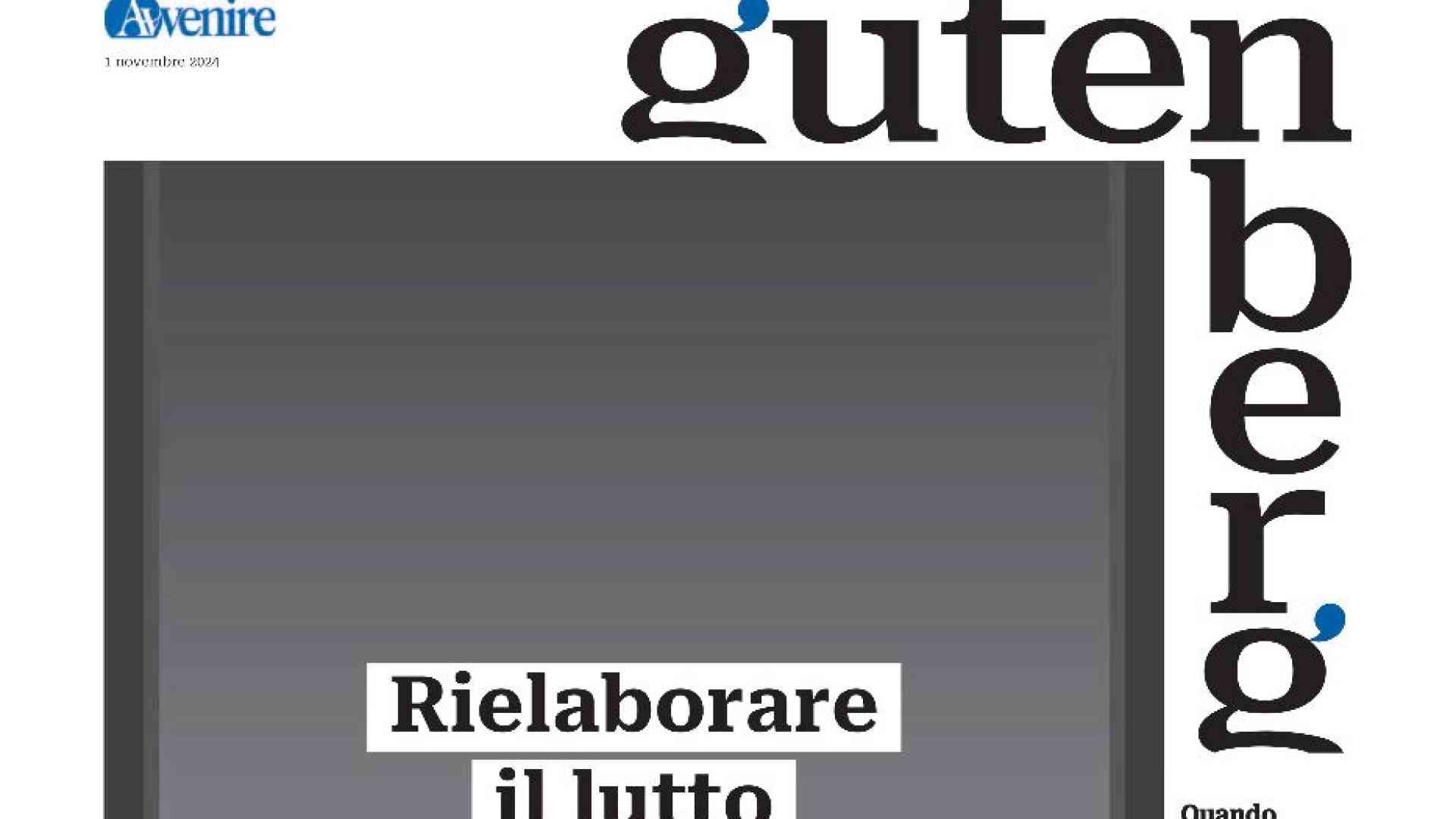 La dolorosa fatica di accettare l'Eterno è il cuore della riflessione del sacerdote e scrittore Alessandro Deho': viviamo la scomparsa di una persona amata come un furto, e a ragione, ma non dobbiamo colpevolizzare le lacrime. Elaborare il lutto è portare a casa il dolore, e nell’amore capace di durare più della morte si respira già il profumo della risurrezione. Il percorso di "Gutenberg", accompagnato dalle immagini di Ahndraya Parlato, prosegue poi con un'intervista al tanatologo Davide Sisto, che sottolinea come il dolore sui social faccia meno paura perché questi media rispondo all'esigenza di condividere il lutto. Condivisione è la parola chiave anche dalla riflessione di Alessandro Zaccuri attorno al dolore dei genitori rimasti "orfani" dei figli; chiudono la sezione monografica una poesia inedita di Alda Merini in morte del figlio di Paolo Volponi e un raro testo del teologo Karl Rahner, tradotto per la prima volta in italiano, che invita al dovere della memoria, soprattutto degli ultimi.