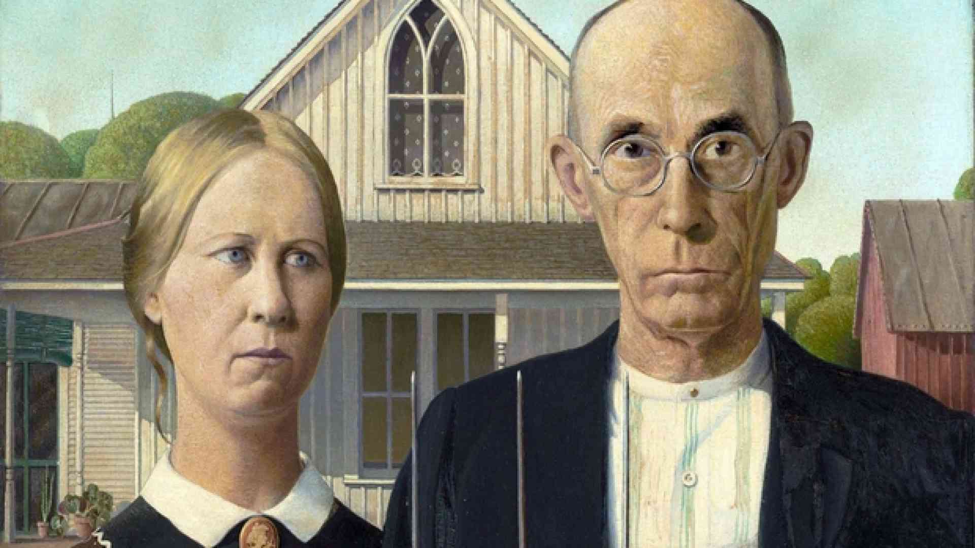 Sangue e zolle impregnate da questo liquido vitale. Si pensa al quadro di Otto Dix entrando al Museo dell’Orangerie a Parigi per vedere la mostra sulla pittura americana degli anni 30. Si pensa a Dix quando ci si trova di fronte il quadro-simbolo, o una bandiera del mondo americano dei fondatori, quello dei coloni e delle immense distese rurali: American Gothic, dipinto da Grant Wood nel 1930. Rappresenta in posa frontale un uomo e una donna; lui più anziano, saloppette di jeans, camicia senza collo e giacca scura, stringe in pugno un forcone tenendolo davanti a sé, mentre ti guarda fermo e sicuro: un uomo privo di angoscia, duro come pietra. La donna è la figlia (a posare fu la sorella di Wood), il cui volto è simile a quello di certe Madonne rinascimentali. Alle spalle di entrambi la casa di legno, del tipo 'Carpentier gothic'. Nella tavola di Wood si respira rude ottimismo e un senso fiero del destino americano.