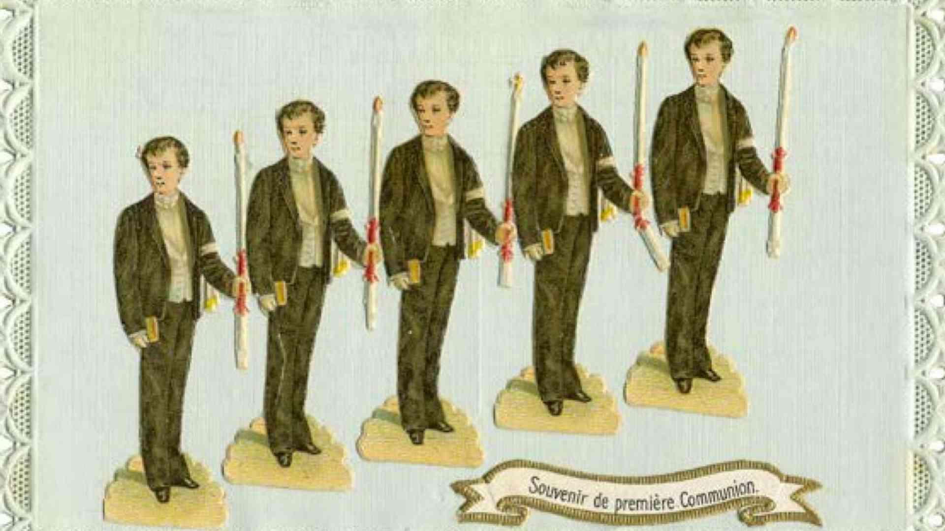 Sopra, un santino stampato dai carmelitani scalzi di Milano alla fine dell’Ottocento Sotto, “Gesù lavoratore”, siderografia con fondo traforato a merletto con motivi floreali, Francia A destra, un ricordo della prima Comunione, collage di pasta d’ostia, Francia