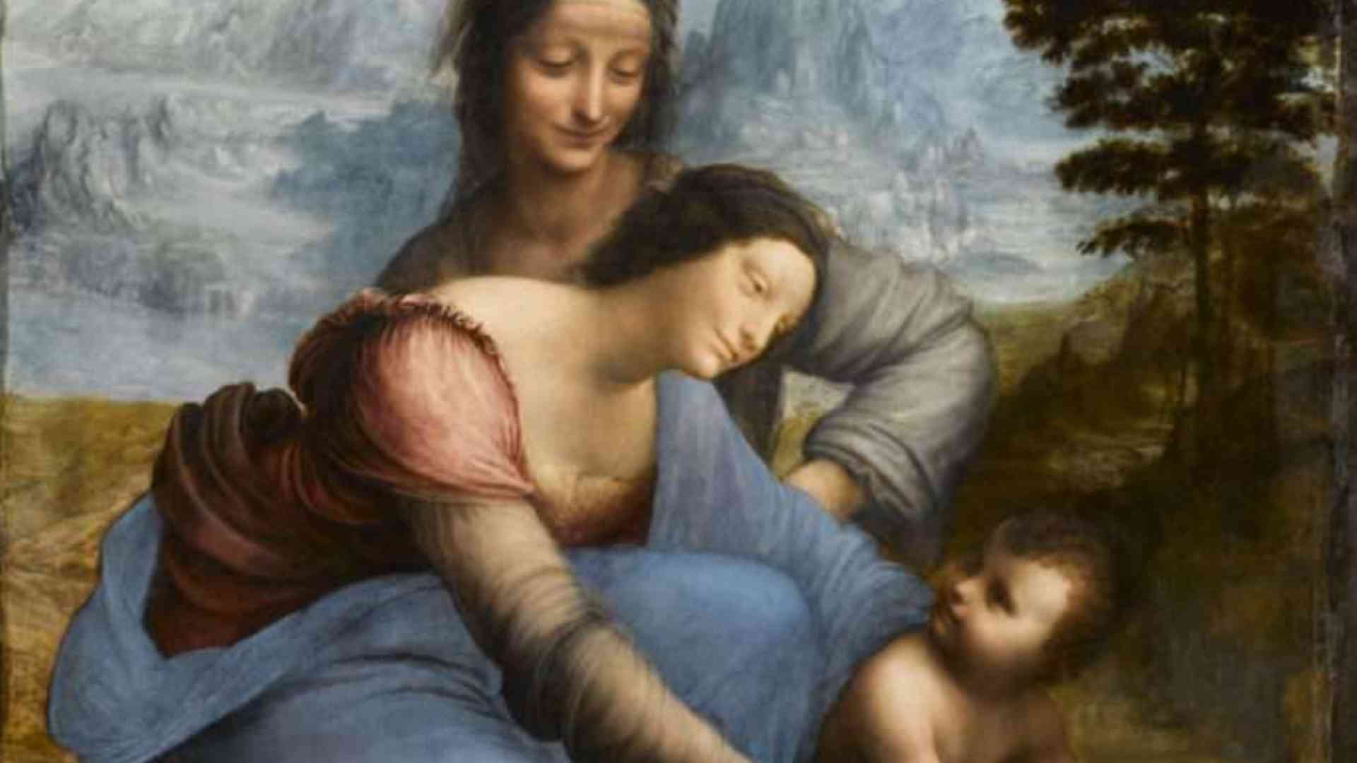 È qui all’opera il celebre “sfumato” leonardesco, la sua capacità cioè di dissolvere la forma plastica nel medium atmosferico. Il tema dominante in questa Sacra Famiglia al femminile, è quello della Redenzione che la Vergine rappresenta e della Chiesa universale, Madre e Maestra, simboleggiata da sant’Anna, mamma di Maria e nonna di Gesù. Un mondo di affetti e di tenerezza stringe la scena in un gomitolo di sorrisi. È singolare come un uomo che non ha avuto famiglia come Leonardo, appaia nella sua pittura così sensibile alla rappresentazione degli affetti domestici e al miracolo della vita che si trasmette attraverso il succedersi delle generazioni.