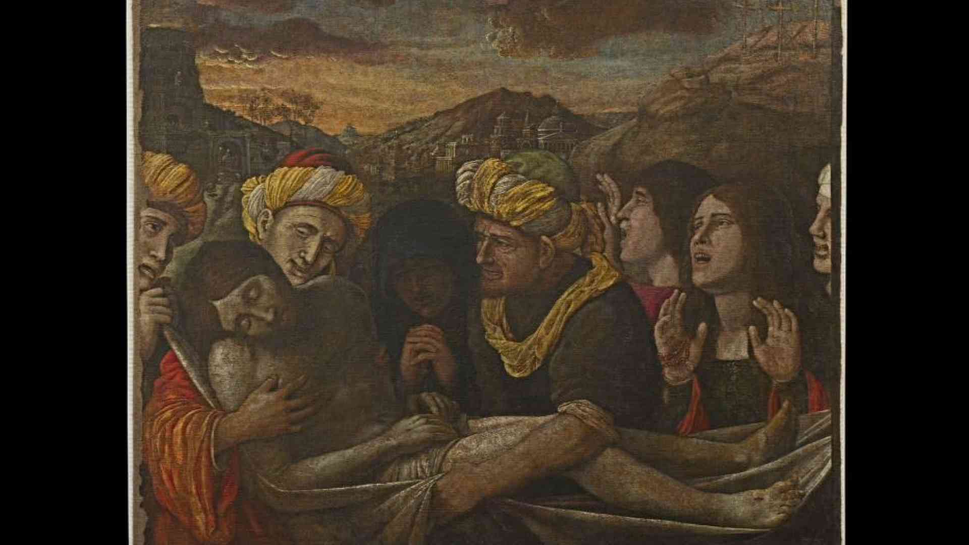 Il corpo morto di Cristo domina la scena, avvolto dal sudario e sorretto dagli uomini affranti. Maria è raffigurata al centro, in penombra, ripiegata su sé stessa. A destra, Maddalena alza il volto al cielo urlando dal dolore, con il volto cosparso di lacrime. Sullo sfondo, la luce del tramonto illumina i monumenti di una Gerusalemme che rievoca una Roma antica, con tanto di Pantheon. Questa Deposizione, ritrovata pochi anni fa nel Santuario di Pompei, di cui vi diamo l’anticipazione, è opera di Andrea Mantegna (1431-1506), e da giovedì 20 sarà in mostra nella pinacoteca dei Musei Vaticani a Roma per alcuni mesi.