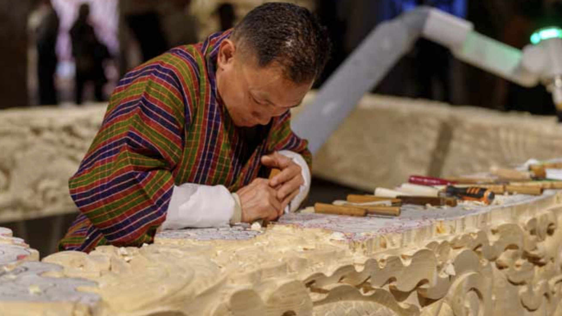 Un dato è indubbio: l’essere umano mantiene un ruolo insostituibile nella produzione di senso. In omaggio al profilo dell’autore, vorrei proporre una testimonianza eloquente dal mondo dell’arte. Durante la Diciannovesima Mostra Internazionale di Architettura è stata esposta un’opera emblematica: Ancient Future, un progetto artistico di BIG Architecture in cui uomo e macchina si sono confrontati in una dimostrazione dal vivo di intaglio su un prototipo di trave in legno lamellare incollato, destinato al nuovo aeroporto internazionale di Gelephu, in Bhutan. Due sezioni della struttura, dalla forma a diamante, sono state intagliate a mano da artigiani bhutanesi – Sangay Thsering e Yeshi Gyeltshen – mentre le altre due sono state scolpite da un braccio robotico fresatore. Osservando l’opera, si coglie l’incapacità della macchina di eguagliare la bellezza creativa e la profondità espressiva dell’artigianalità umana.