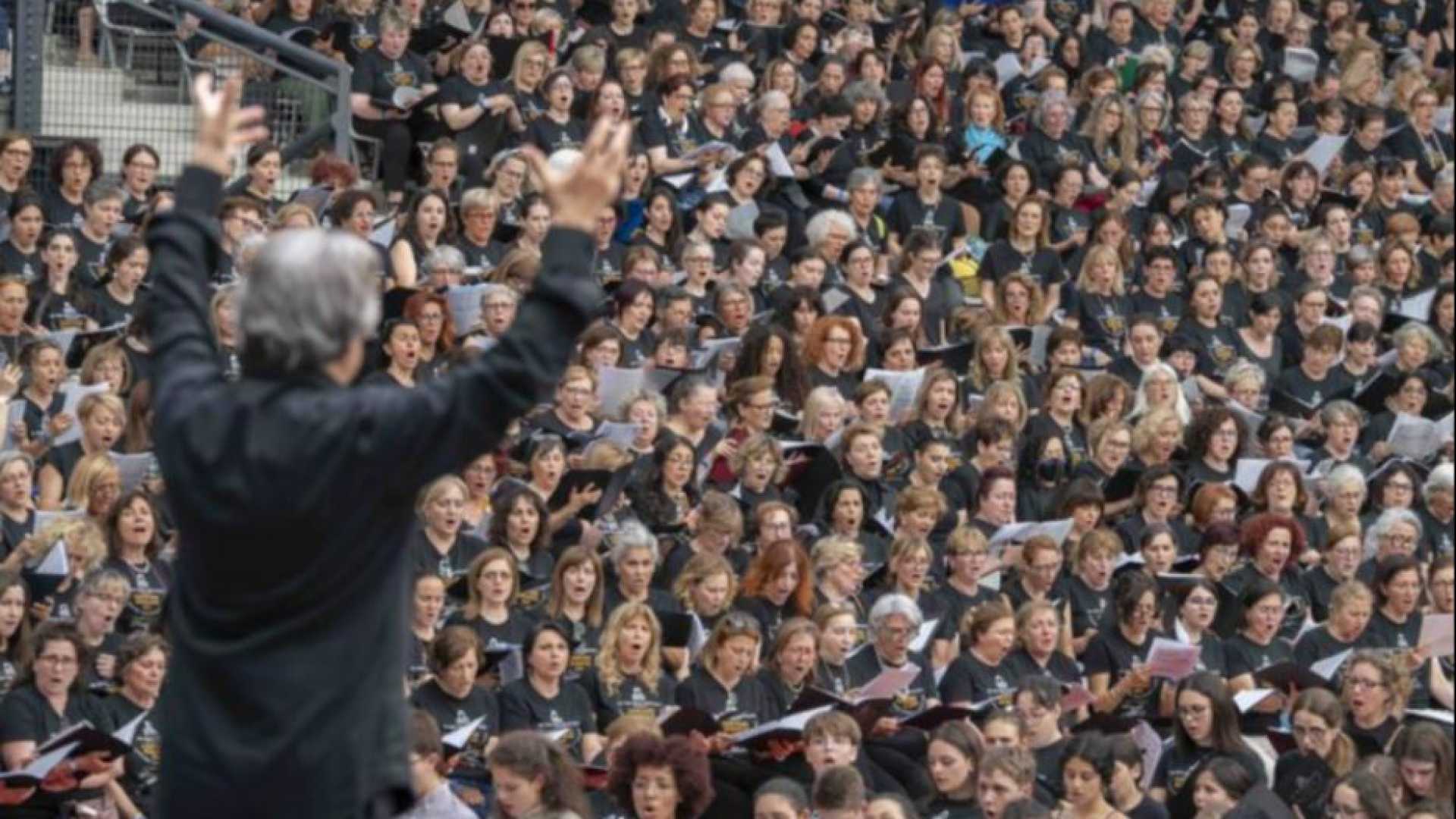 Parte la ola. Come allo stadio. Lui arriva sul palco di corsa. Saltando a grandi passi – a luglio saranno 84 anni, incredibile. E si lascia abbracciare dall’applauso dei tremila coristi, 3.116 per la precisione, che riempiono il Pala De André. Ravenna, oltre il porto, direzione mare. Ordinatissimi. I tenori in platea, soprani sugli spalti a destra, contralti su quelli a sinistra, nella gradinata che corre in fondo al palazzetto i bassi. Ognuno con il suo braccialetto colorato. Una maglietta uguale per tutti, Cantare amantis est la scritta che evoca sant’Agostino. Hanno dai 4 agli 87 anni. Ci sono anche le voci bianche, in prima fila. La più piccola sale sul palco e lui la prende in braccio. «Oggi è il 2…?» chiede dal palco. «Giugno!» rispondono tutti in coro. «Festa della…?». «Repubblica!». «Dal latino…?». «Res publica!». Sorride e allarga le braccia. «Allora alzatevi in piedi e cantiamo l’Inno di Mameli».