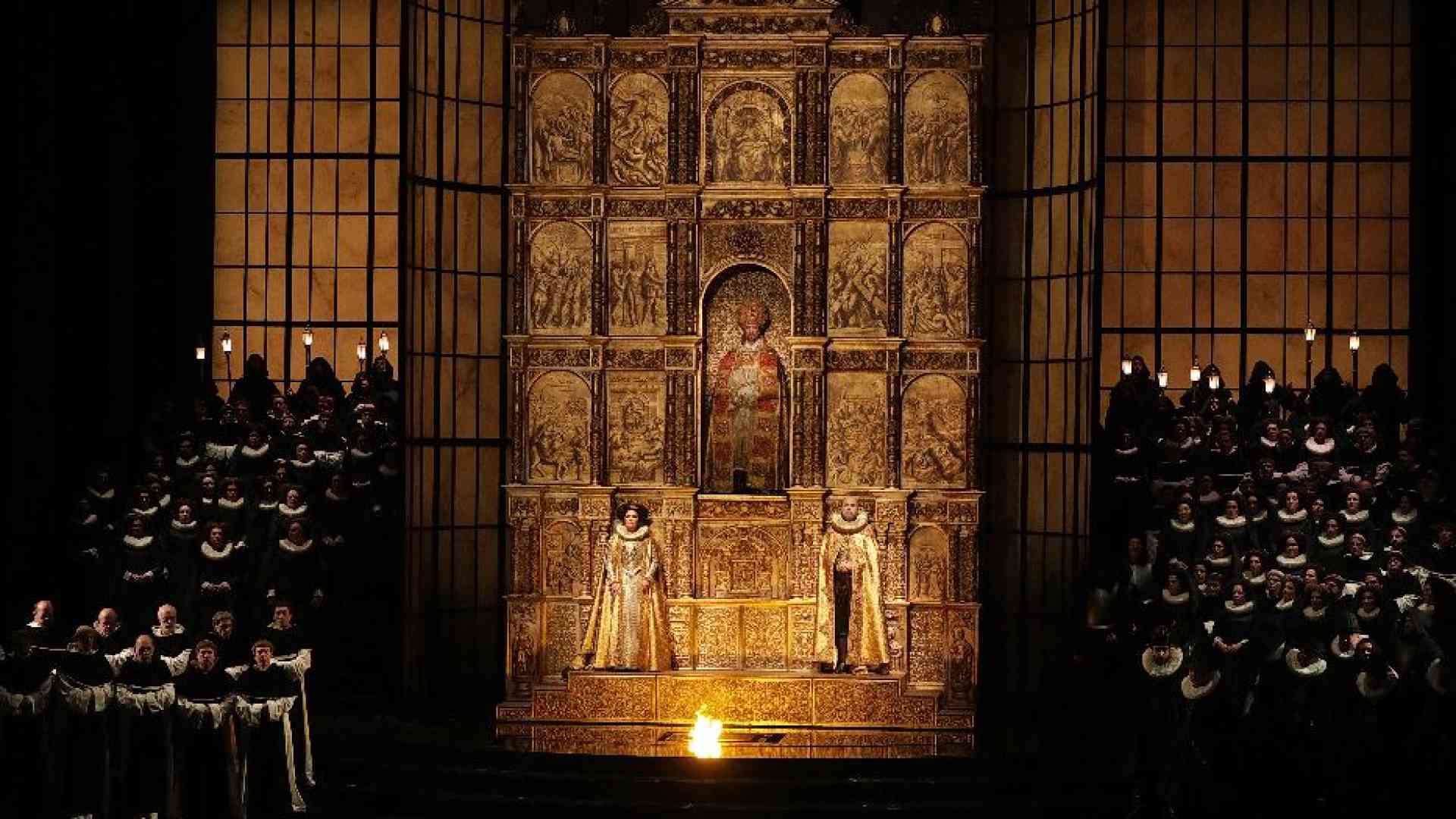 Inizia con una cerimonia funebre il Don Carlo di Chailly e Pasqual, che è un lungo piano sequenza di musica e immagini. Un flusso continuo che inizia e finisce con un abisso di morte. In orchestra una marcia funebre, sul palco un rito che vede i frati prendere scettro e corona dall’urna di Carlo V per incoronare, in fretta e senza clamore, Filippo II. Siamo nel chiostro del convento di San Giusto. E da qui non ci muoviamo per tutto lo spettacolo. Non si muovono i personaggi, fantasmi che popolano questo mausoleo di morti (lo disegna Daniel Bianco), un’imponente torre di alabastro che si apre e si chiude mostrando i vari luoghi dell’azione, sempre ecclesiali: nello studio di Filippo i sedili sono quelli di un coro ligneo, la scena dell’autodafé è tutta davanti ad un retablo d’oro sul quale, come icone di una grande pala d’altare, sono incastonati Filippo ed Elisabetta – e qui, mentre divampa il rogo degli eretici, Pasqual accende le luci in sala per tirarci dentro nello spettacolo. Un Don Carlo anticlericale quello annunciato dal regista spagnolo, ma di zampate, di graffi che lasciano il segno in questo senso non ce ne sono. Anche perché basta Verdi, cosa c’è di più forte se non la frase di Filippo «Dunque il trono piegar dovrà sempre all’altare»?