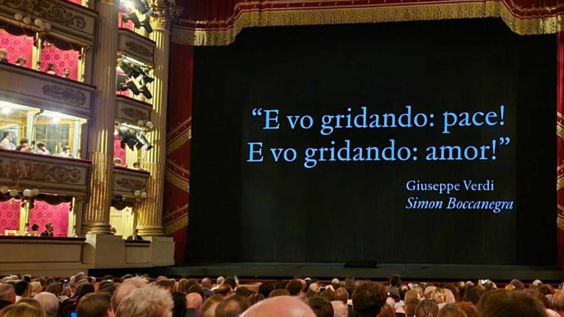 «Cessate il fuoco». Scritta azzurra su fondo nero. Mezzeluci in sala. I palchetti illuminati. Rosso Scala. Rosso sangue. «Stop the war». Stesso colore, azzurro su nero. Poi la frase di Giuseppe Verdi – anche se di lì a poco la musica che invaderà la sala sarà quella di Richard Wagner, anche se il tedesco non ha combattuto (a suon di musica) per la libertà del suo popolo, a differenza del nostro «padre della patria». Ancora azzurro su nero, l’invocazione di Simon Boccanegra, «… e vo’ gridando: pace! E vo’ gridando: amor!». Grido inascoltato, oggi come ieri, quello del doge raccontato, in musica, da Verdi. Così il Teatro alla Scala, prima che la musica ipnotica e dilatata di Wagner, tirasse dentro per cinque ore nel racconto delle avventure di Siegfried – avventure di un uomo che cerca la sua identità e la sua libertà – così il Teatro alla Scala ha voluto, ancora una volta dire la sua sull’attualità. Certo, ogni giorno, lo fa la musica, capace, ieri come oggi, di parlare al nostro presente con una forza che è culturale e allo stesso tempo politica, senza che le sia messo in testa uno slogan. Un presente di guerra in Medioriente e in Ucraina, in Myanmar e in tante (troppe) parti del mondo. Soprattutto in Palestina. Hanno voluto dire i lavoratori scaligeri chiedendo al sovrintendente Fortunato Ortombina di incorniciare il wagneriano Siegfried con questo grido silenzioso. Rumoroso, invece, quello andato in scena, sempre prima dell’inizio dell’opera, sulla piazza. Anche questo sotto l’occhio vigile del sovrintendente. Bandiere della Palestina. Ma anche dei sindacati che hanno voluto ancora una volta accendere le luci sul licenziamento di una maschera che ha lasciato il posto che doveva presidiare per affacciarsi in sala, srotolare uno striscione e gridare «Palestina libera» durante un concerto privato in occasione dell’incontro annuale dell'Asian development bank al quale era presente anche la premier Meloni. Fuori le proteste. Dentro un applauso carico di affetto e dolore. «E vo’ gridando: pace! E vo’ gridando: amor!» dice Boccanegra.