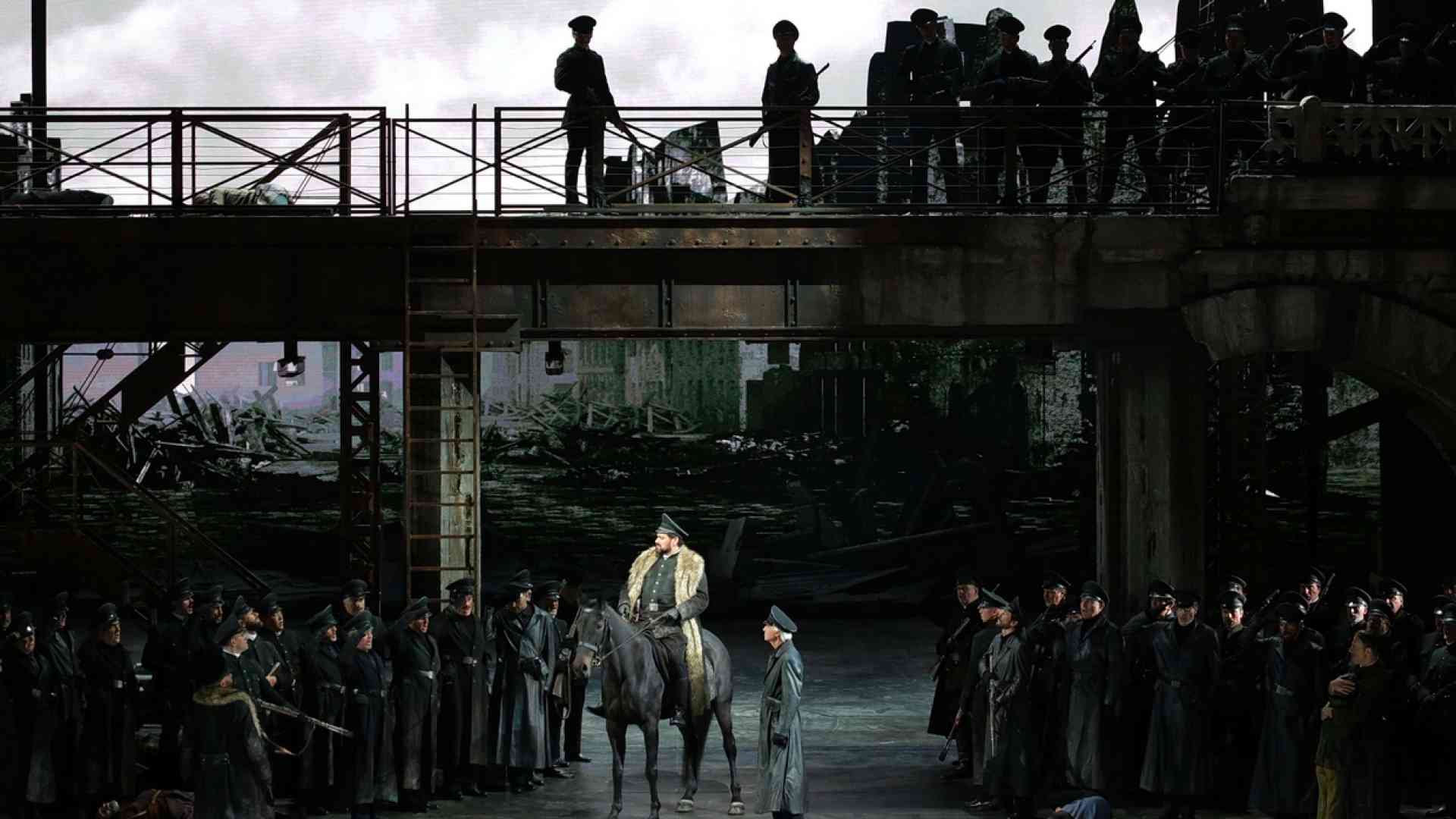 Dai sotterranei del palco si materializza la scenografia: un ponte di ferro e pietra diroccato. “Urli, rapine, gemiti, sangue, stupri, rovine e stragi e fuoco”. C’è tutto sulla scena che si affolla di un’umanità oppressa, quella dell’Italia della Seconda guerra mondiale: camionette della polizia, fucilazioni di piazza raccontano quello che "d’Attila è giuoco". E un grande videogame della storia è la regia di Livermore che ricostruisce come in un cinegiornale - costumi filologici di Gianluca Falsachi - le atmosfere dell’epoca. Racconta come in un film alla Roma città aperta la storia di Odabella che vuole vendicare il padre ucciso da Attila. Punto di partenza del libretto che Livermore rievoca in un flusso di memoria dove le scene – disegnate dallo studio Giò Forma tra frammenti di edifici e video – si susseguono in dissolvenza.