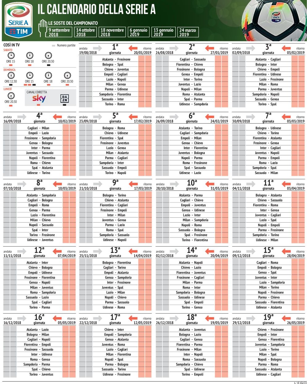 È stato reso noto il calendario del campionato di calcio di serie A 2018-2019. Inizio il 18 agosto, conclusione il 26 maggio.