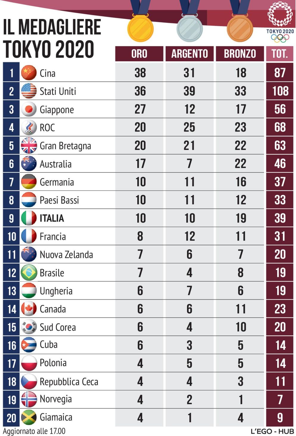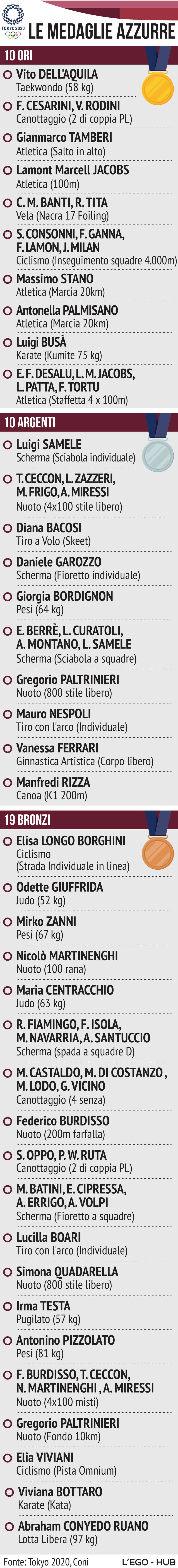 <Agorà<SportCondividiPrintIl medagliere olimpico e quello azzurro. Per l'Italia è recorddi RedazioneTutte le medaglie assegnate alle Olimpiadi in Giappone. Per il nostro Paese è il miglior risultato di sempre1 min di letturaAugust 6, 2021Ansa | © RIPRODUZIONE RISERVATA