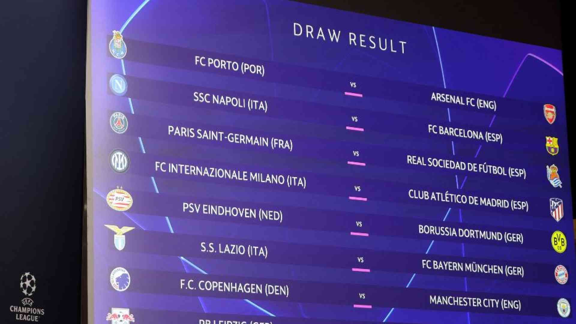 Non ha troppo di che sorridere, invece, la Lazio, abbinata a un Bayern che ha stravinto il proprio girone, che stranamente non comanda la Bundesliga in questo momento (davanti c’è il Bayer Leverkusen in questo momento) ma è anche la squadra che eliminò la Lazio dagli ottavi di Champions 2020-21, con i tedeschi che vinsero 4-1 all’Olimpico e 2-1 in Germania.Gli altri accoppiamenti metteranno di fronte il Porto all’Arsenal, il Paris Saint-Germain alla Real Sociedad, il Psv Eindhoven al Borussia Dortmund, il Copenaghen al Manchester City campione uscente e il Lipsia al Real Madrid, in quella che, ranking dei club alla mano, sarà la sfida più prestigiosa degli ottavi, anche se poi a livello empirico è tutto da dimostrare.