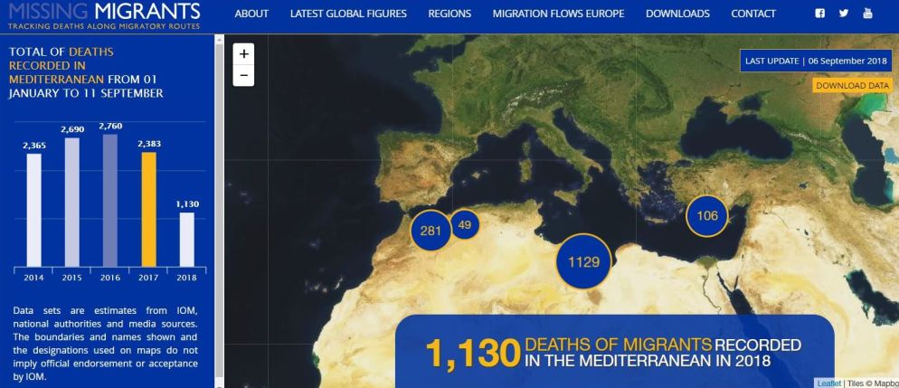 Almeno 1.130 migranti e rifugiati sono morti quest'anno a largo delle coste libiche (1.549 in tutto il Mediterraneo) in un disperato tentativo di raggiungere le coste europee. A riferirlo è l'Organizzazione internazionale per le migrazioni. Secondo i dati dell'Oim, tra il primo gennaio e il 9 settembre 2018 sono avvenuti 1.549 decessi, lungo le cinque principali rotte marittime che attraversano il mar Mediterraneo, verso Italia, Grecia, Malta, Cipro e Spagna. Il numero di migranti e rifugiati che sono arrivati in Europa quest'anno è di 73.696, quasi un terzo del totale dello scorso anno di 172.362 e quasi un settimo dei 348mila registrati nel 2016.