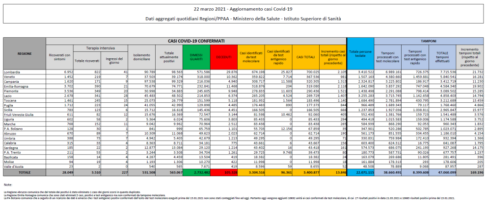 Le regioni che hanno registrato più casi nelle ultime 24 ore sono Emilia-Romagna (2.118), Lombardia (2.105), Piemonte (1.521), Lazio (1.407) e Campania (1.313).