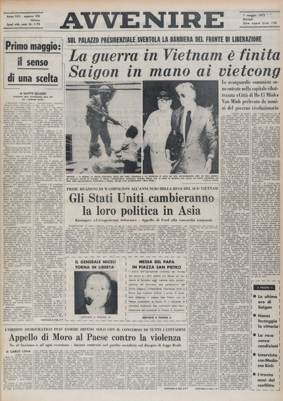 La fine viene raccontata a puntate per un mese. Primo aprile: «In Vietnam si sfalda il governo di Thieu. Il presidente Lon Nol lascia la Cambogia». A pagina 3 il commento di Enzo Ferraiuolo: «Due dittatori al tramonto». Avvenire non tace l’esodo di massa di vietnamiti in fuga verso sud. Il 2 aprile in «La lunga agonia di un popolo». Ferraiuolo appare titubante: «È difficile, in questo momento di dramma collettivo, stabilire da che parte è la responsabilità dell’"esodo di massa"». Il 3 aprile, udienza generale del mercoledì, il titolo è: «Paolo VI sul martirio del popolo vietnamita».