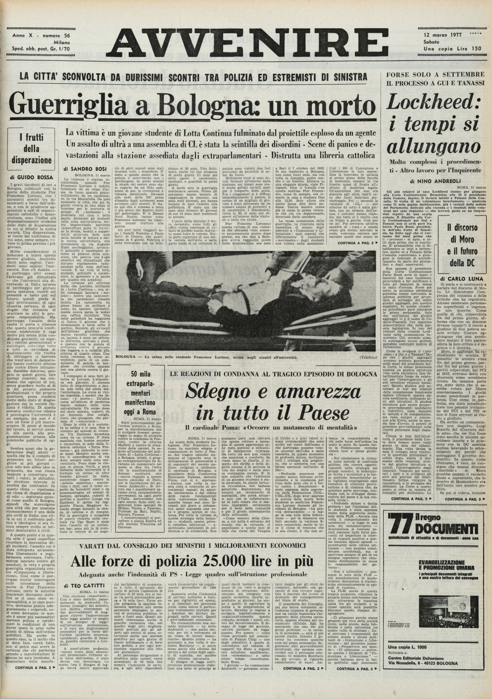 Una data è arbitraria, la violenza è un crescendo. Ma l’inizio del Settantasette, con la nascita di Autonomia operaia, lo troviamo in prima pagina di Avvenire il 12 marzo: «Guerriglia a Bologna: un morto». Il sommario: «La città sconvolta da durissimi scontri tra polizia ed estremisti di sinistra. La vittima è un giovane di Lotta continua fulminato dal proiettile di un agente. Un assalto di ultrà a un’assemblea di Cl è stata la scintilla dei disordini. Scene di panico e devastazioni alla Stazione assediata dagli extraparlamentari. Distrutta una libreria cattolica». Scrive Sandro Bosi: «La violenza è esplosa incontrollata quando Pier Francesco Lorusso è caduto (...). Dopo, in città si sono scatenate la rabbia e il caos». La libreria Terra Promessa bersagliata dalle molotov. Piazza Maggiore, via Bassi, la Stazione... «Non si contano gli episodi di violenza».