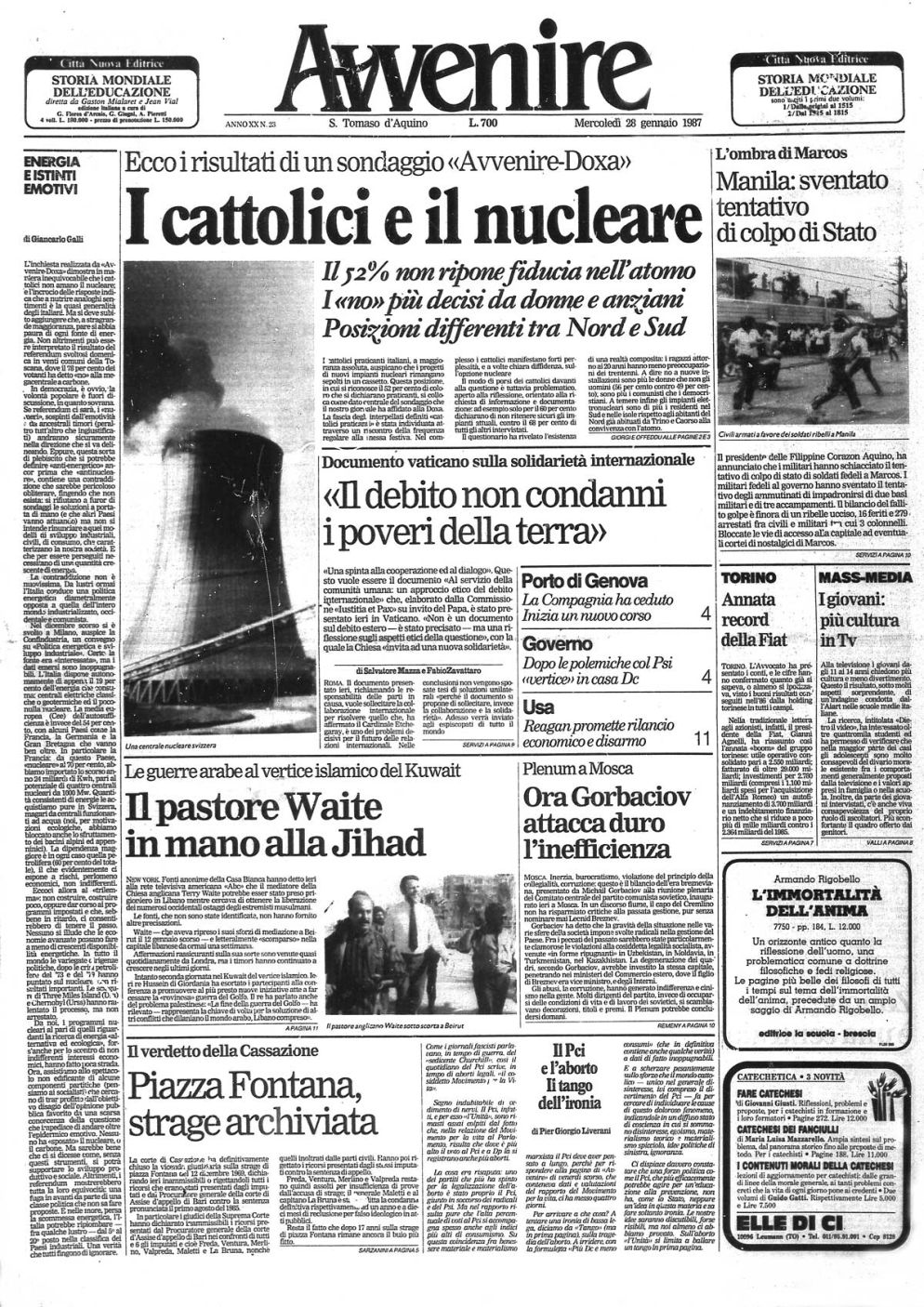 A casa nostra, in Avvenire, si chiede nel corso dell’87 un modesto sacrificio ai lettori: dal 1° marzo il giornale si presenta in edicola a prezzo leggermente maggiorato rispetto agli altri quotidiani. Continuerà a dare puntuali resoconti di quanto accade nel mondo e nella Chiesa, il cui magistero papale si arricchisce di due encicliche, la Redemptoris Mater (25 marzo) e la Sollicitudo rei socialis (30 dicembre).