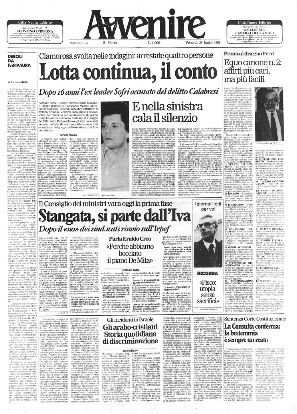 La notizia scoppia il 29 luglio 1988, un venerdì di sole e spiagge. «Lotta continua, il conto. Clamorosa svolta nelle indagini: arrestate quattro persone. Dopo 16 anni l’ex leader Sofri accusato del delitto Calabresi». La cronaca in prima pagina è firmata da Piero Piccioli. «E nella sinistra – è il titolo del pezzo d’appoggio – cala il silenzio». Il breve pezzo senza firma spiega: «I magistrati milanesi non sono magistrati d’assalto e l’unico che se la sente di gridare da subito è il senatore verde Marco Boato». Boato sarà il difensore più convinto di Sofri, Bompressi e Pietrostefani, da subito. Mai crederà al pentito Marino: «È un’incredibile montatura» dice l’ex Lc a Luigi Geninazzi.