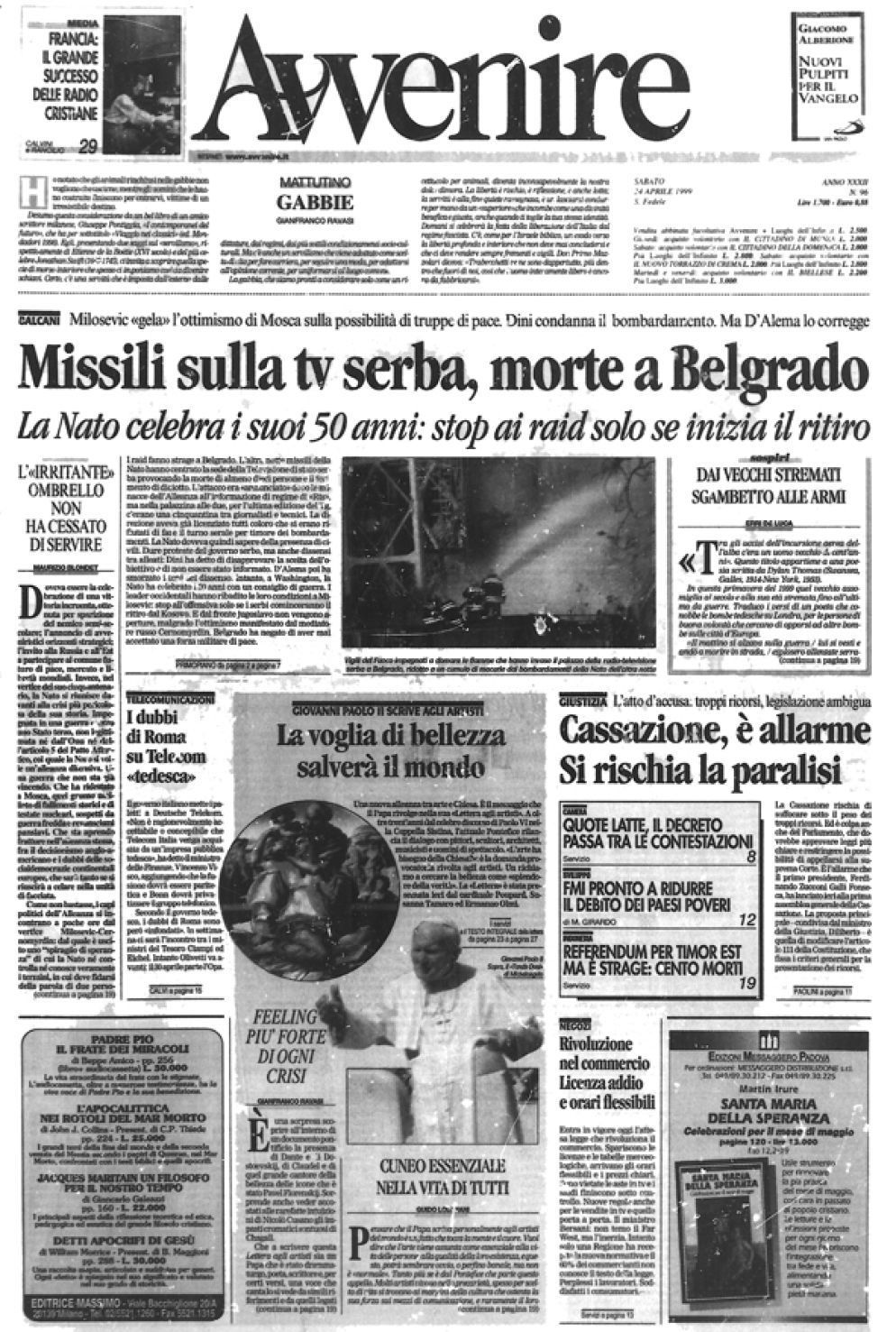 Riguardo al Papa, che aprirà la Porta Santa in San Pietro la vigilia di Natale per l’avvio del Giubileo del 2000 (un evento di risonanza davvero ecumenica) importante è stato il suo pellegrinaggio apostolico compiuto in India e in Georgia tra il 6 e il 9 novembre, tappa di rilievo nel rafforzamento del dialogo con le altre confessioni cristiane e la altre religioni. Significativo il gesto che Giovanni Paolo II ha compiuto il 2 maggio presiedendo personalmente in San Pietro la cerimonia di beatificazione di un umile frate cappuccino, Pio da Pietrelcina, Padre Pio, la cui canonizzazione seguirà di lì a poco, il 26 giugno 2002. Avvenire dell’anno 1999 ricorderà una gradita visita in redazione, quella effettuata il 30 aprile dal cardinale arcivescovo di Milano Carlo Maria Martini. Cordialissimo l’incontro con i vertici aziendali, i giornalisti e il personale poligrafico.