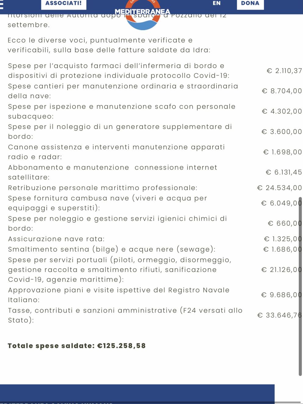 Proprio una serie di confronti interni mostrano che, in senso inverso alle conclusioni della procura, non vi fosse alcuna certezza che Maersk potesse effettuare una donazione. Al centro c’è proprio il ruolo dei vertici, che secondo i magistrati agiscono mostrando “una gelosa cura della segretezza di certi dati contabili”. A cominciare dai debiti, che avrebbero potuto spaventare gli attivisti, calcolati nell’autunno scorso in circa 750 mila euro. I conti in rosso venivano ripianati dove possibile non solo grazie alle donazioni, ma attraverso prestiti infruttuosi, restituiti con modalità a informali che gli inquirenti stanno monitorando. Una gestione della contabilità infatti, più simile a quella di una associazione, ma che nel caso di una società armatrice deve fare i conti con modalità eminentemente imprenditoriali. Un mese di navigazione, infatti, secondo la procura di Ragusa arriva a costare circa 120 mila euro e in due anni Mediterranea aveva dovuto affrontare anche sequestri amministrativi, multe, spese legali, oltre agli stipendi per il marinai professionali e quelli per alcuni dipendenti, tra cui lo stesso Luca Casarini, che percepiva uno stipendio di poco superiore a 1.500 euro al mese.