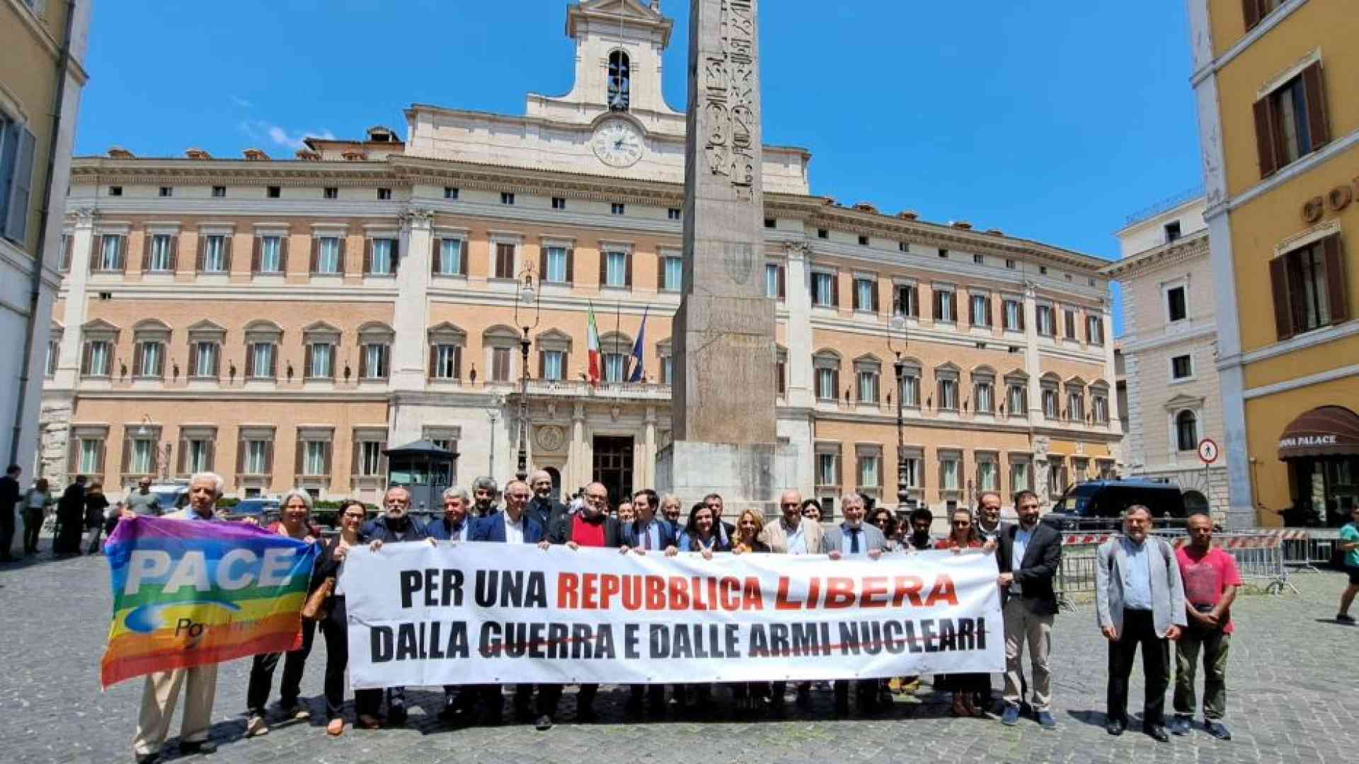 Per Paolo Ciani di Demos «con la guerra all'Ucraina c'è stato un preoccupante cambiamento culturale sull'uso delle armi. Respingiamo le accuse di irragionevolezza e astrazione della realtà, perché solo fermare la guerra è ragionevole e concreto. Il Papa all'indomani dell'invasione russa con un gesto irrituale si è recato all'Ambasciata russa presso la Santa Sede. Invece a Strasburgo si vota per usare i fondi del Pnrr e per la Coesione sociale per produrre munizioni». «Ragionevole è l'abolizione della armi nucleari - concorda Nicola Fratoianni dell'Alleanza Verdi e Sinistra - mentre è sciagurato e indecente usare per le armi in fondi del Pnrr, una scelta che tradisce le ragioni del piano per la Next Generation Eu, pensato come risposta solidale alle ferite prodotte dalla pandemia». A conclusione dell'incontro - cui ha partecipato anche Francesco Silvestri del Movimento 5 stelle - i promotori hanno srotolato davanti a Montecitorio lo striscione con la richiesta di adesione a Tpnw, proprio mentre in cielo sfrecciavano a bassa quota le Frecce Tricolori per le prove della parata del 2 giugno.