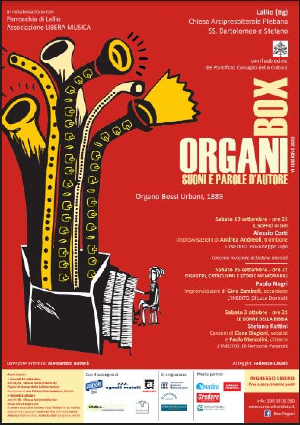 È tutto pronto a Lallio (Bergamo) per la nuova edizione di Box Organi, rassegna di concerti d'organo tra classica, jazz e letteratura dedicata quest'anno alla Bibbia e che ruota attorno al prezioso Bossi Urbani del 1889. Appuntamento di suoni e parole d'autore, diretto da Alessandro Bottelli, promosso dalla parrocchia di Lallio con l'associazione Libera Musica nella chiesa dei santi Bartolomeo e Stefano, che si aprirà il 19 settembre alle 21 con Alessio Corti.