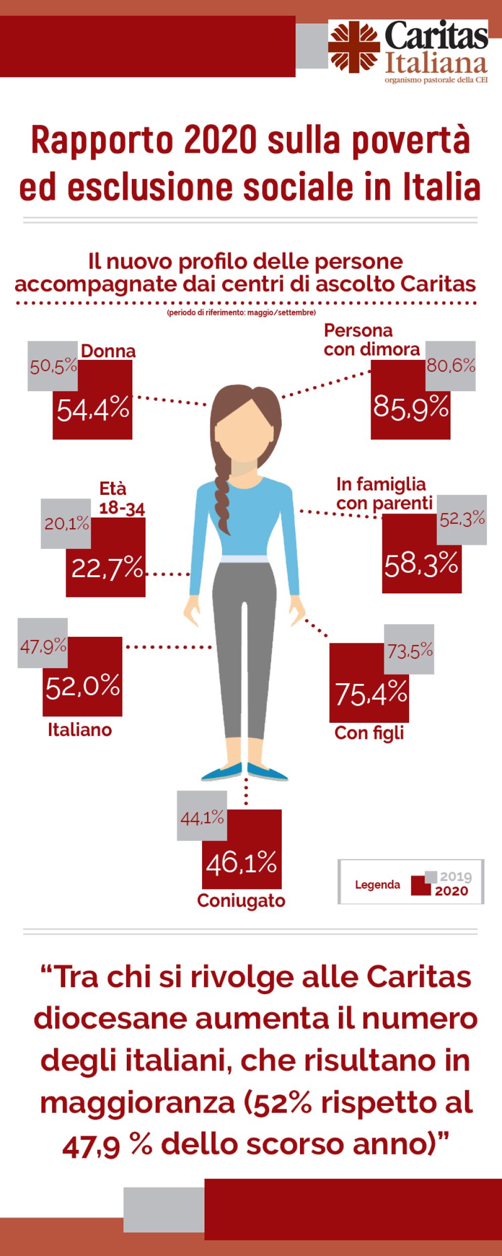 Un quadro di impoverimento inaspritosi in pochi mesi allargando la platea degli ultimi. I nuovi poveri che nel 2020 si sono presentati per la prima volta ai centri di ascolto sono passati dal 31% al 45%. Significa che quasi una persona su due che si rivolge alla Caritas in parrocchia non si era mai vista. E sempre di più sono famiglie con minori, donne, giovani che dal precariato sono passati alla disoccupazione. Per chi guarda al passaporto degli ultimi, i nuclei di italiani sono la maggioranza (52% rispetto al 47,9 % dello scorso anno).
