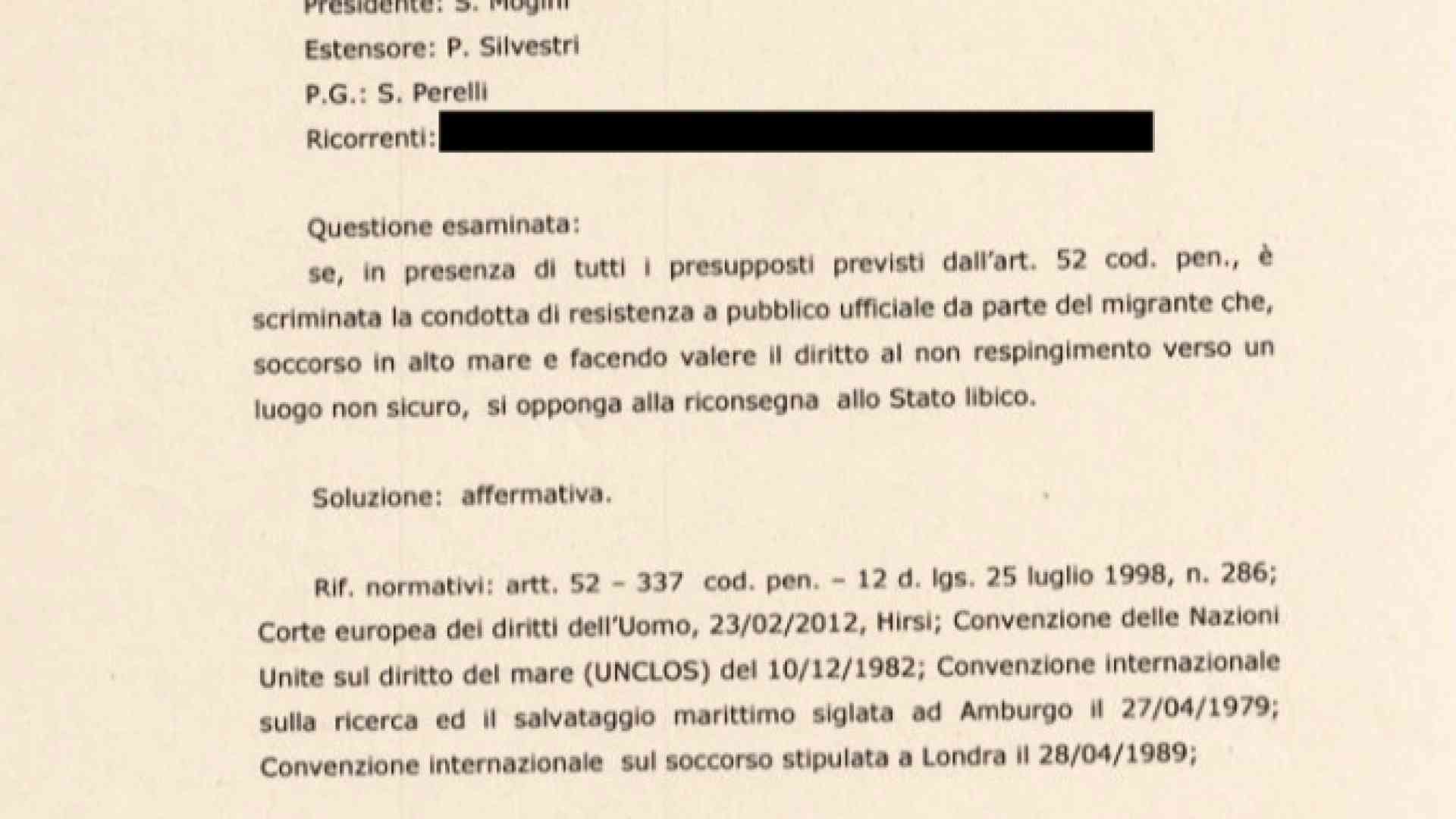 La domanda riportata nel dispositivo della suprema corte riguarda la legittimità della “condotta di resistenza al pubblico ufficiale da parte del migrante che, soccorso in alto mare e facendo valere il diritto al non respingimento verso un Paese non sicuro, si opponga alla riconsegna alla Stato Libico”.