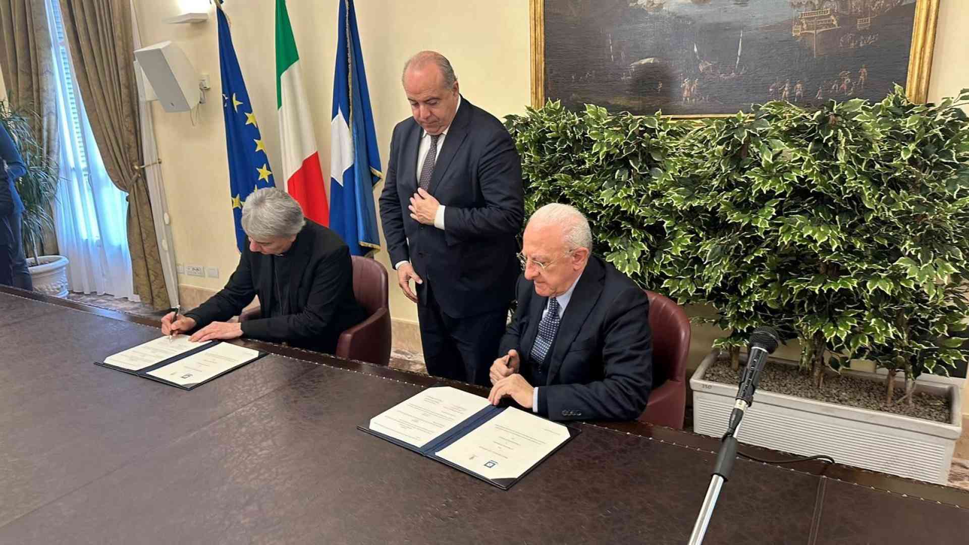 Sui principi della gratuità e della sussidiarietà, l'arcivescovo Battaglia e il presidente della Regione Campania, De Luca, firmano un protocollo per valorizzare i beni artistici e religiosi