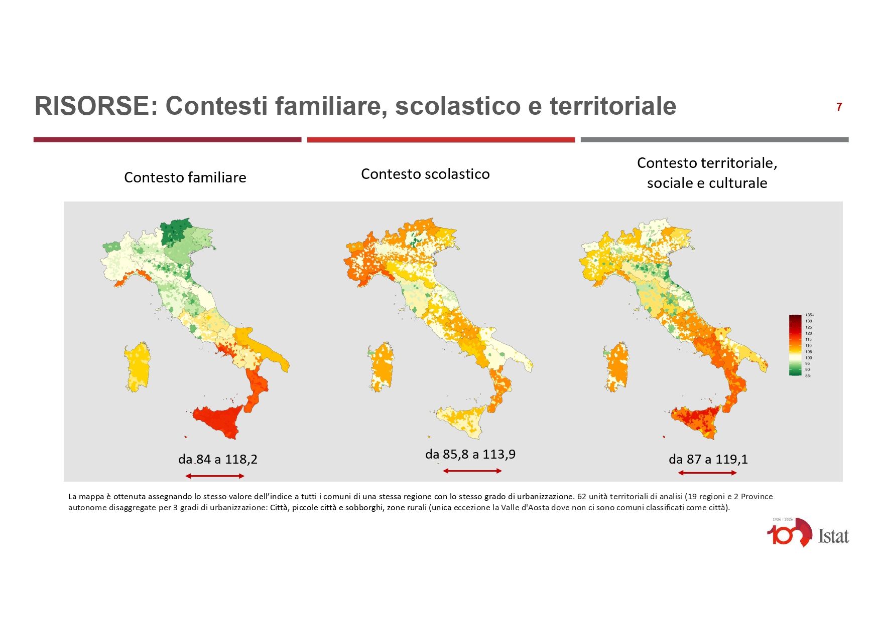 La commissione Istat ha confrontato 78 indicatori per disegnare le mappe, visionate in anteprima da Avvenire, che si dividono in due gruppi: quelle che misurano gli esiti individuali della povertà educativa (come i risultati delle prove Invalsi) e quelle che, invece, analizzano i fattori di rischio. Ovvero i contesti sociali, culturali e familiari «in cui il diritto al pieno sviluppo può essere compromesso». Tutti gli indici sono stati sintetizzati in un unico numero che ha permesso di colorare i Comuni italiani, raggruppati in 62 unità a seconda del grado di urbanizzazione, in una scala che va dal verde (per i risultati migliori della media nazionale, fissata a quota 100) al rosso (per i risultati peggiori). «Sarebbe interessante confrontare i risultati anche con quelli di altri Paesi europei – commenta Pratesi –. Magari ci costringerebbero a colorare tutta l’Italia di rosso».