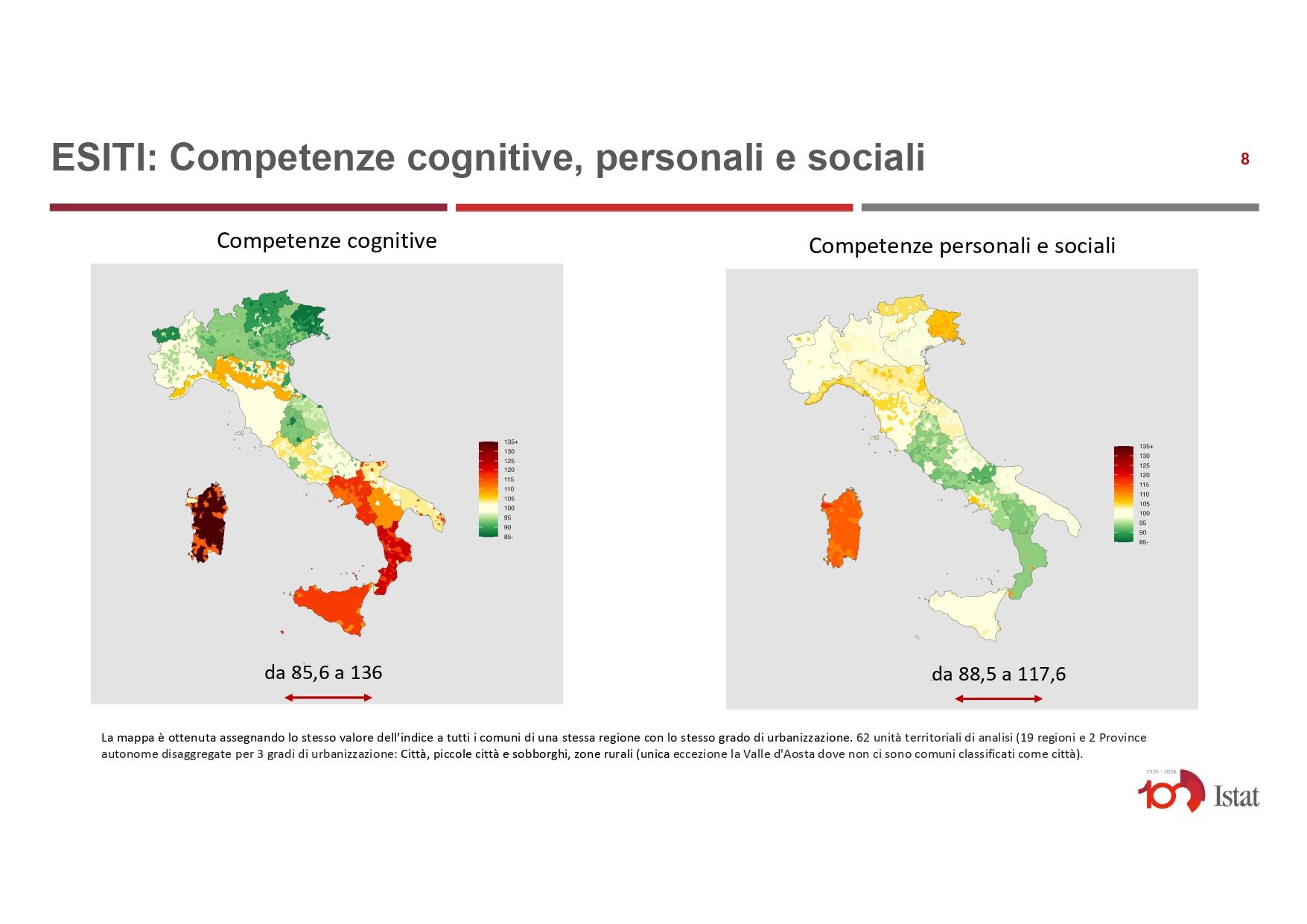 Per quanto riguarda le competenze cognitive dei giovani italiani, tutto sommato, i risultati seguono l’asse Sud-Nord: Sardegna, Calabria e Campania sono le regioni più rosse. Seguite dalla Liguria e dall’Emilia-Romagna, soprattutto nelle aree interne. Tutto cambia, però, se si prendono in considerazione le capacità relazionali ed emotive degli studenti, che fanno registrare i migliori risultati in Campania, Lazio, Basilicata e Molise. «Potrebbe significare che la scuola ha ancora un ruolo forte al Sud – ragiona Pratesi –. Il contesto scolastico sarebbe in grado di compensare le difficoltà territoriali, sociali e culturali che vive il Meridione».