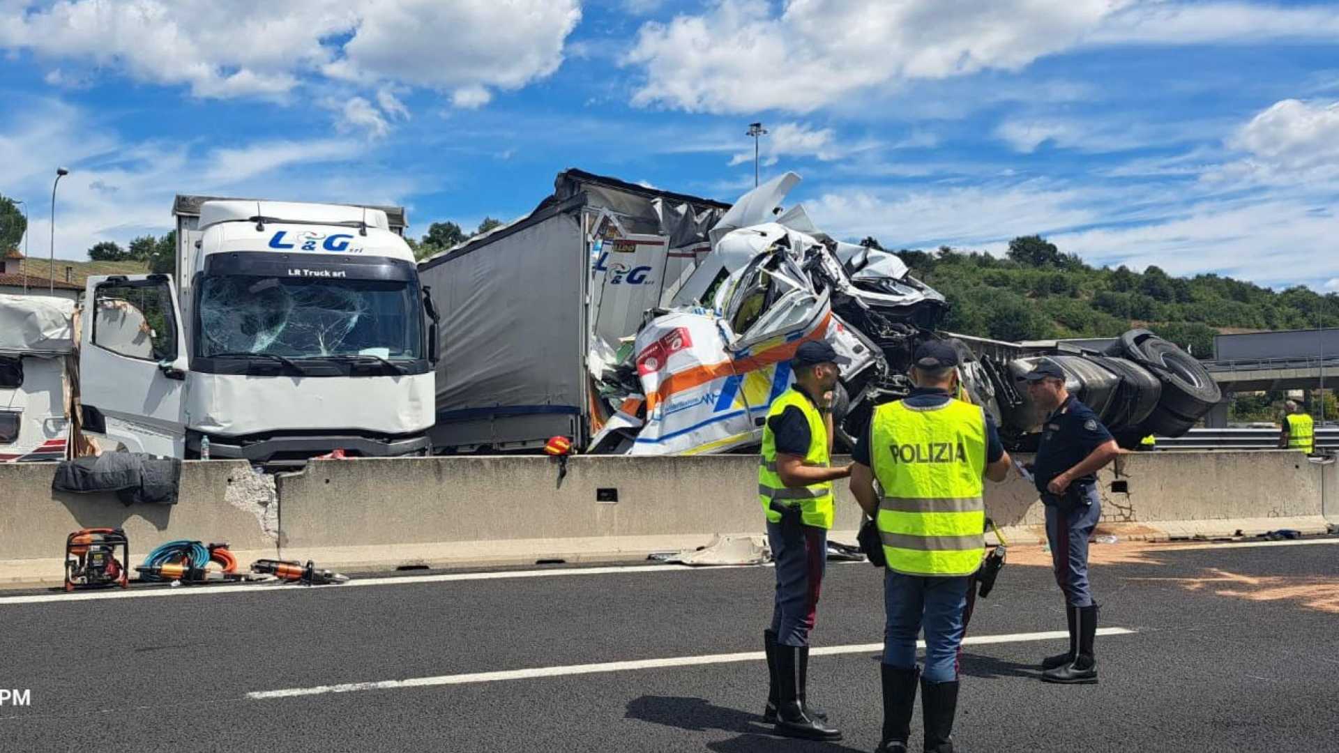 Un caravan, un mezzo pesante, tre auto e un’ambulanza coinvolti, per un totale di tre morti e 15 feriti, di cui uno in codice rosso: è questo il tragico bilancio di un incidente avvenuto in A1 fra le uscite di Arezzo e Valdarno. Le vittime sono il paziente trasportato dall'ambulanza e due sanitari a bordo: Gianni Trappolini, 56 anni, dipendente, e Giulia Santoni, 23 anni, che faceva servizio civile. Tutti e due erano in servizio alla Misericordia di Terranuova Bracciolini.