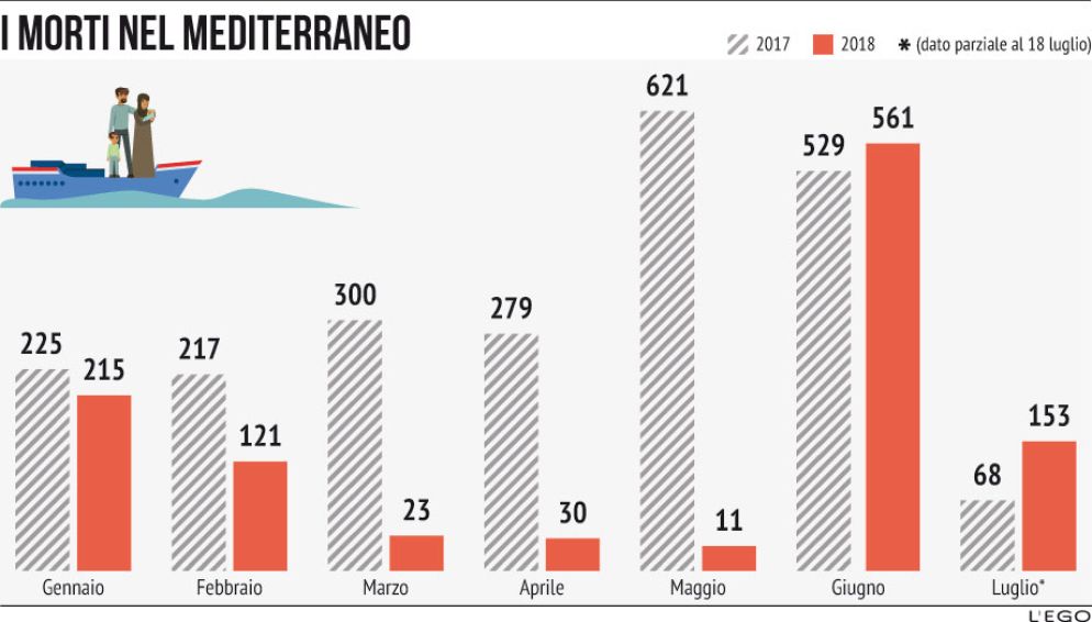 I morti, nel Mediterraneo, sono in aumento. I dati diffusi nelle ultime ore dall’Organizzazione internazionale per le migrazioni (Oim) smentiscono chi adduce come argomento per la chiusura dei porti, e per la criminalizzazione dei soccorsi in mare, l’equazione “meno sbarchi, meno morti”. Mentre il Papa torna a gran voce a chiedere la fine delle morti e delle tragedie in mare. Nel giugno 2018 i morti sulla tratta centrale del Mediterraneo (cioè quella che ha per destinazione l’Italia e Malta) sono stati 564, contro i 529 dello stesso mese del 2017, e il trend – siamo soltanto al 18 luglio – è in forte aumento: 153 contro 68. Contestualmente, a fronte dei 23.524 arrivi relativi allo stesso periodo dello scorso anno, a giugno sono sbarcati in Italia soltanto 3.371 profughi. Non è difficile capire che in proporzione il mese appena trascorso è stato infinitamente più letale.