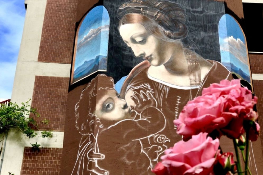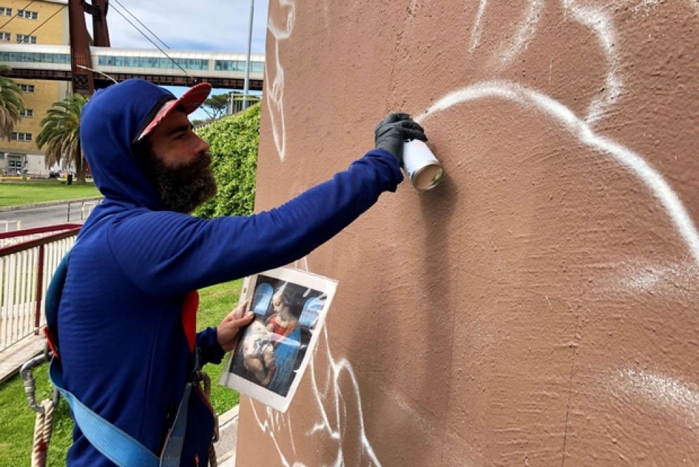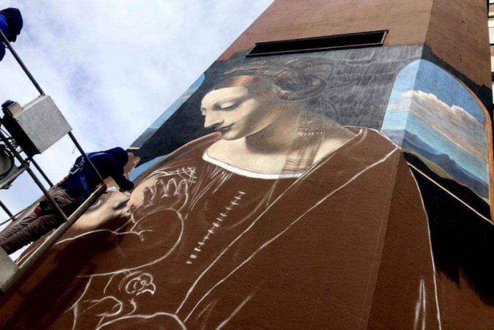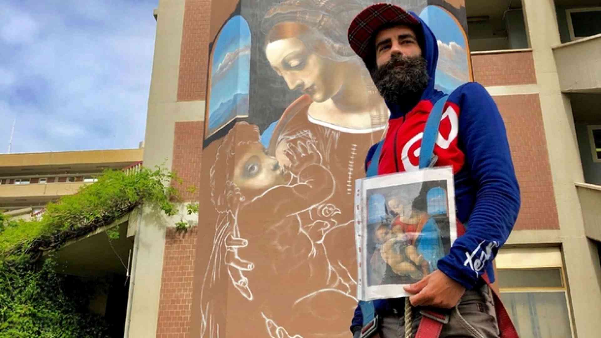 Dal 6 all’11 maggio lo street artist varesino sta riproducendo il capolavoro leonardesco la “Madonna Litta” su una delle pareti esterne di un edifico dell’ospedale universitario
