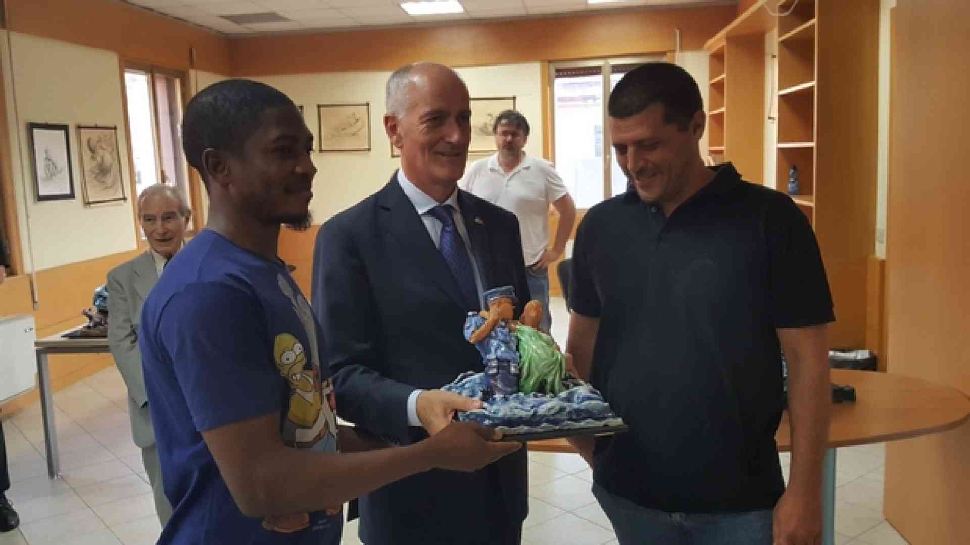 «Grazie, grazie per averci salvato. Grazie per avermi aiutato e per tutto quello che fate per noi». Sono le parole di Fasasi Abeedeen, 32 anni, rifugiato nigeriano, scultore, mentre regala una sua opera al capo della Polizia Franco Gabrielli. Una terracotta dipinta che rappresenta una migrante salvata dalle acque da un poliziotto. L'occasione è la mostra di quindici sculture di Fasasi intitolata «L'approdo: dopo tanti pericoli l'arrivo in un porto sicuro», che Gabrielli ha visitato in forma privata. Quasi da amico, anche se la sua riflessione è anche da responsabile dell'ordine pubblico. «Questa è integrazione. Solo così possiamo evitare che queste persone finiscano nei ghetti che poi possono diventare anche problemi di sicurezza. Il futuro è una seria politica di integrazione, è l'unico vero antidoto per l'ordine pubblico e per garantire la convivenza. Noi abbiamo bisogno di loro e l'integrazione è l'unica vera chiave per valorizzare la positività dell'immigrazione».