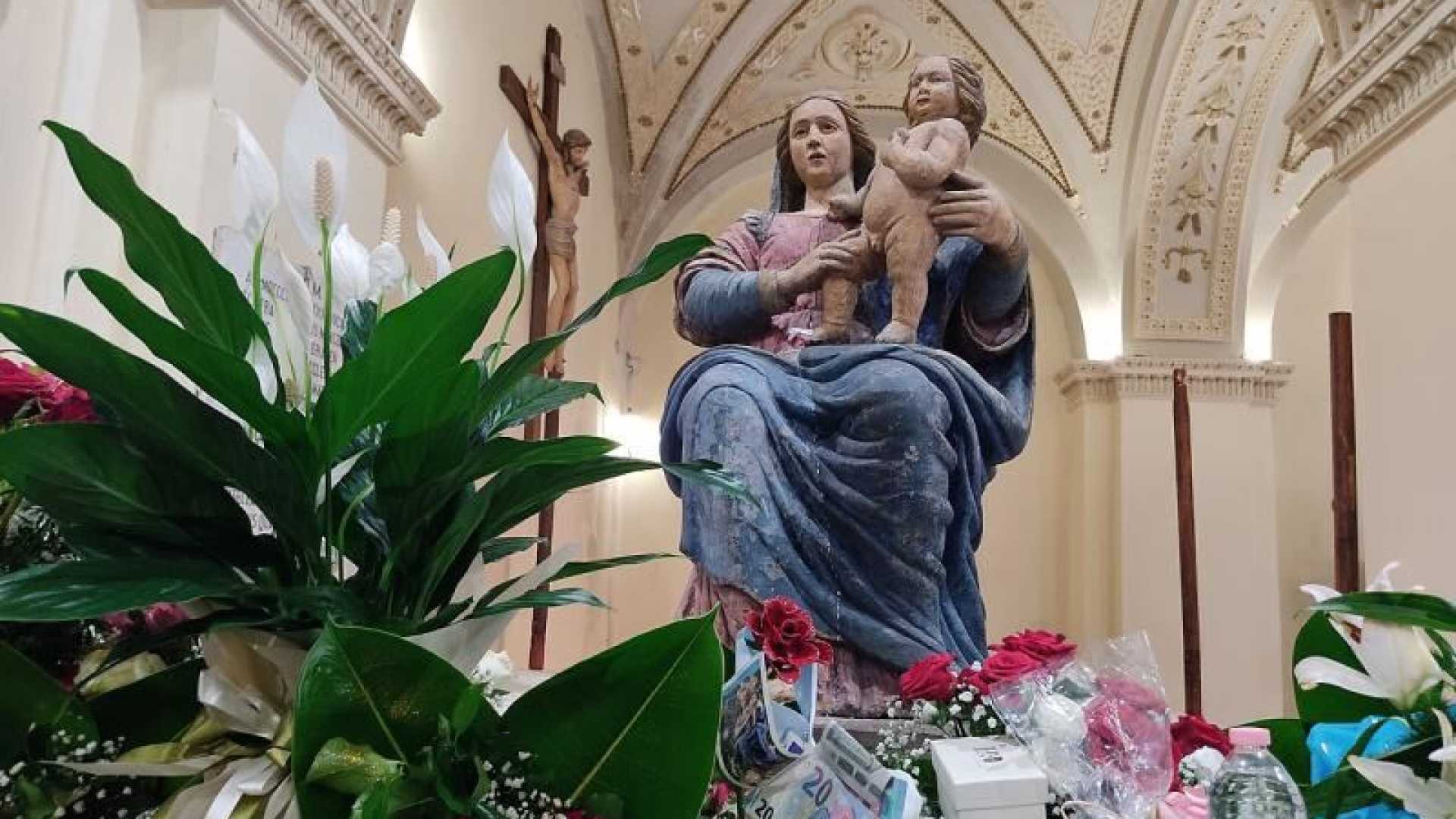 Aggiunge che «anche i lavori della strada, che collega il Paese al Santuario, di cui da tempo si parla, grazie al finanziamento regionale, dai primi di agosto sono finalmente iniziati e ci auguriamo possano terminare nei tempi previsti». E poi l’annuncio di voler «offrire a tutti i devoti, anche a quelli più lontani ed in difficoltà, possibilità di rendere omaggio a Maria in modo più agevole e sicuro». Così la decisione di «affidare a questa Comunità parrocchiale la custodia della venerata statua della Madonna. Resterà nella vostra Chiesa tutto il tempo necessario, perché possa essere invocata e venerata».