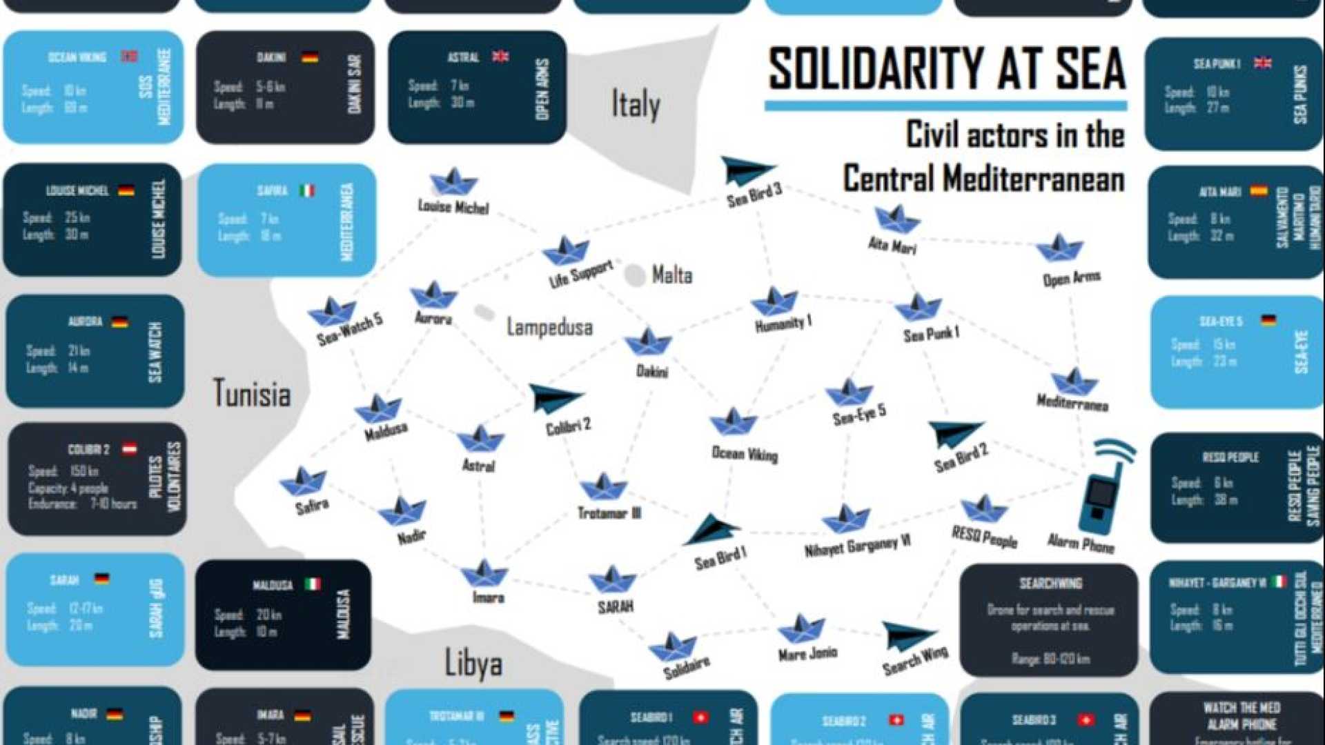 Dopo la conferma dell’ennesima tragedia del mare, con solo 5 migranti salvati e almeno altri 25 dispersi, ecco la mappa delle navi Ong che attraversano in lungo e in largo il Mediterraneo per salvare vite umane: iI nuovo CMRCC (il Centro di Coordinamento del Soccorso Marittimo Civile che ricopia la sigla dei Mrcc europei – i Centri europei di coordinamento del soccorso marittimo Mrcc) ha l'obiettivo di contribuire alla creazione di una rete di solidarietà a sostegno delle persone in movimento. Sostiene la flotta di Ong che dal 2014 hanno assistito e portato in salvo decine di migliaia di persone. La mappa illustra i vari attori della società civile coinvolti nelle attività di ricerca e soccorso (SAR) nel Mediterraneo centrale. È stata creata utilizzando i dati raccolti da Alarm Phone e dal Civil MRCC dalle diverse organizzazioni che operano nella regione. Ciò è stato fatto attraverso salvataggi marittimi effettuati da navi Ong, voli di monitoraggio aereo con aerei civili, nonché attraverso la hotline Alarm Phone. La mappa illustra i vari attori della società civile coinvolti nelle attività di ricerca e soccorso (SAR) nel Mediterraneo centrale. È stata creata utilizzando i dati raccolti da Alarm Phone e dal Civil MRCC dalle diverse organizzazioni che operano nella regione.